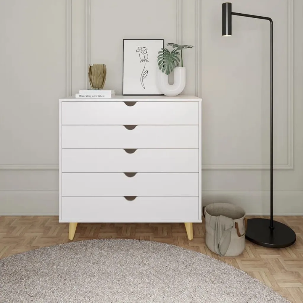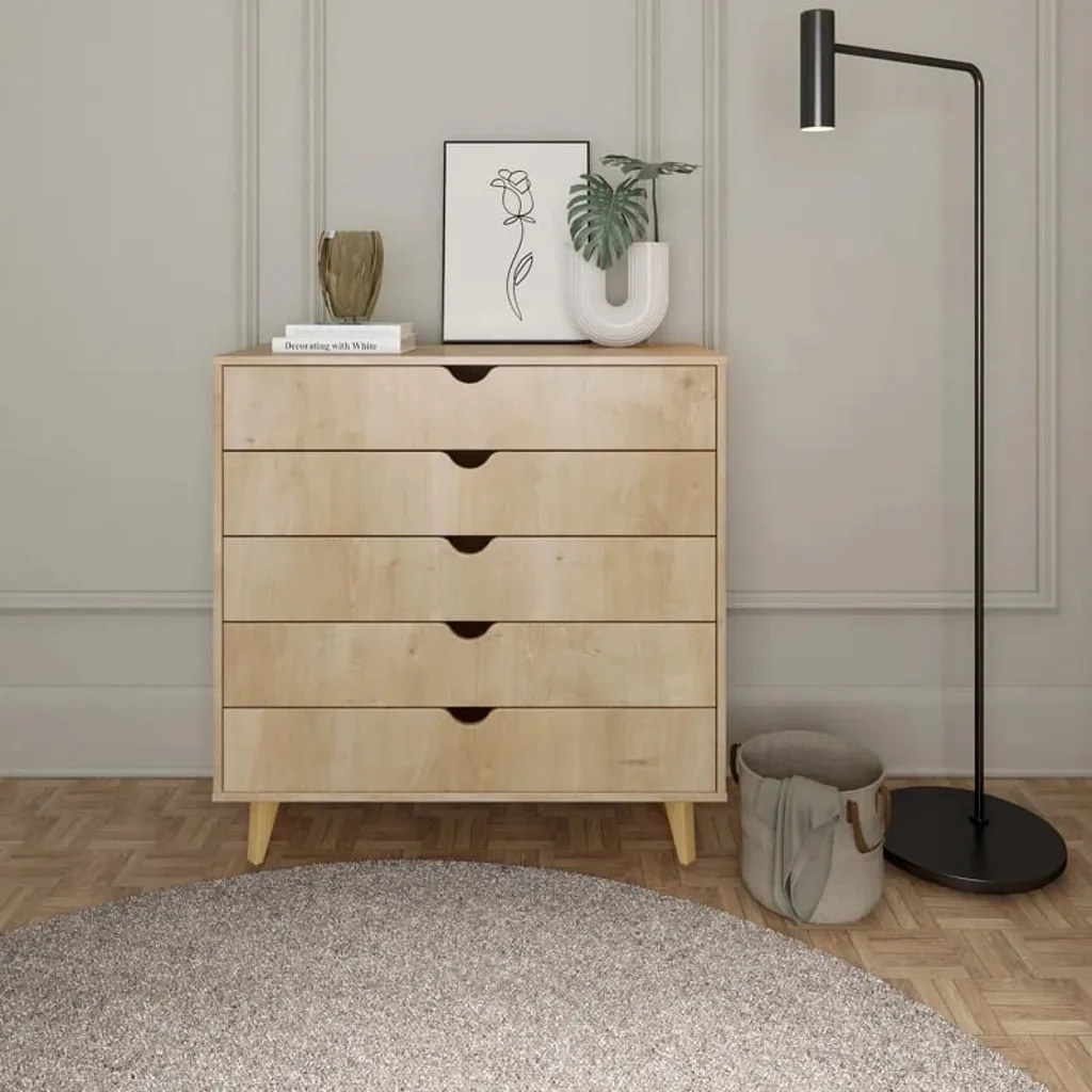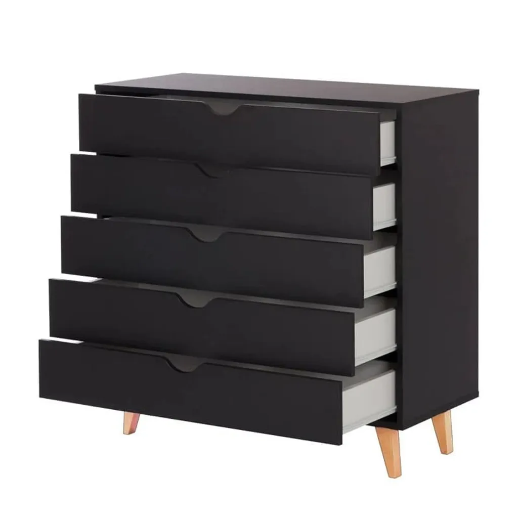 تتميز وحدة الأدراج بتصميم بسيط وعصري، مصنوعة من الخشب عالي الجودة بلون أسود غير لامع، مما يضفي طابعًا أنيقًا ومميزًا يناسب مختلف أنماط الديكور. تحتوي الوحدة على خمس أدراج واسعة ومتساوية الحجم، مزودة بمقابض مدمجة بتصميم نصف دائري في الجزء العلوي من كل درج، مما يعزز من جمالية وبساطة التصميم مع سهولة الاستخدام.