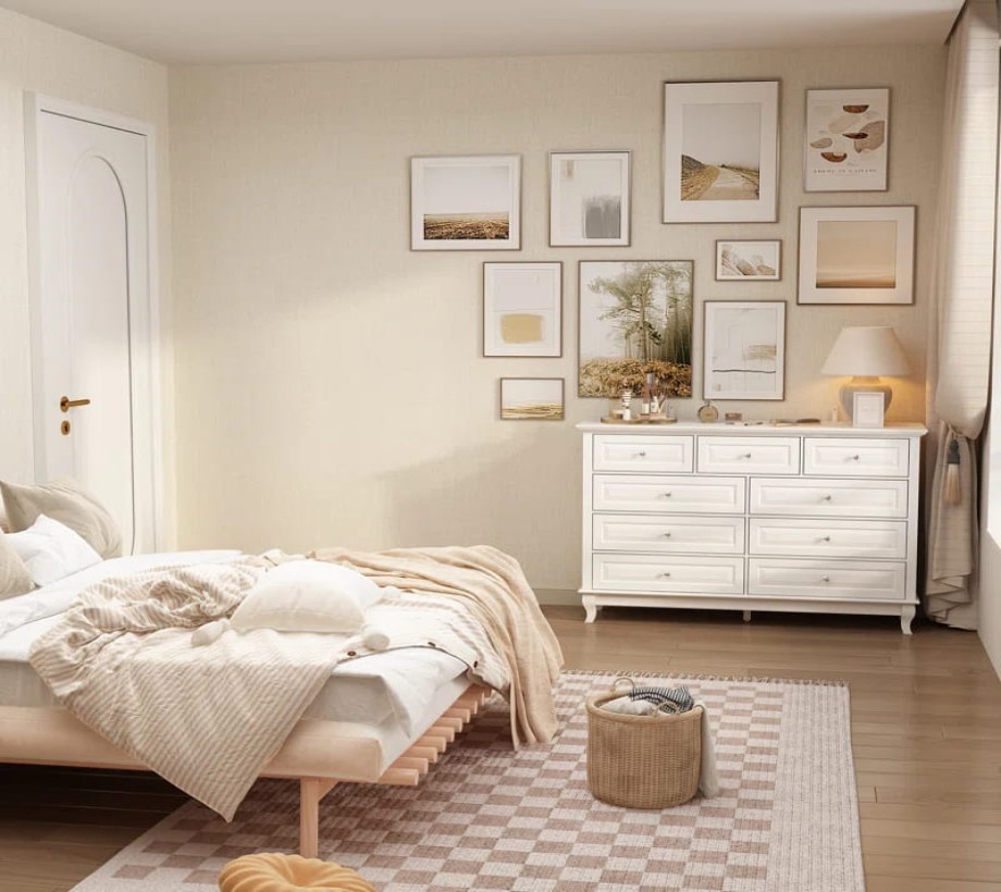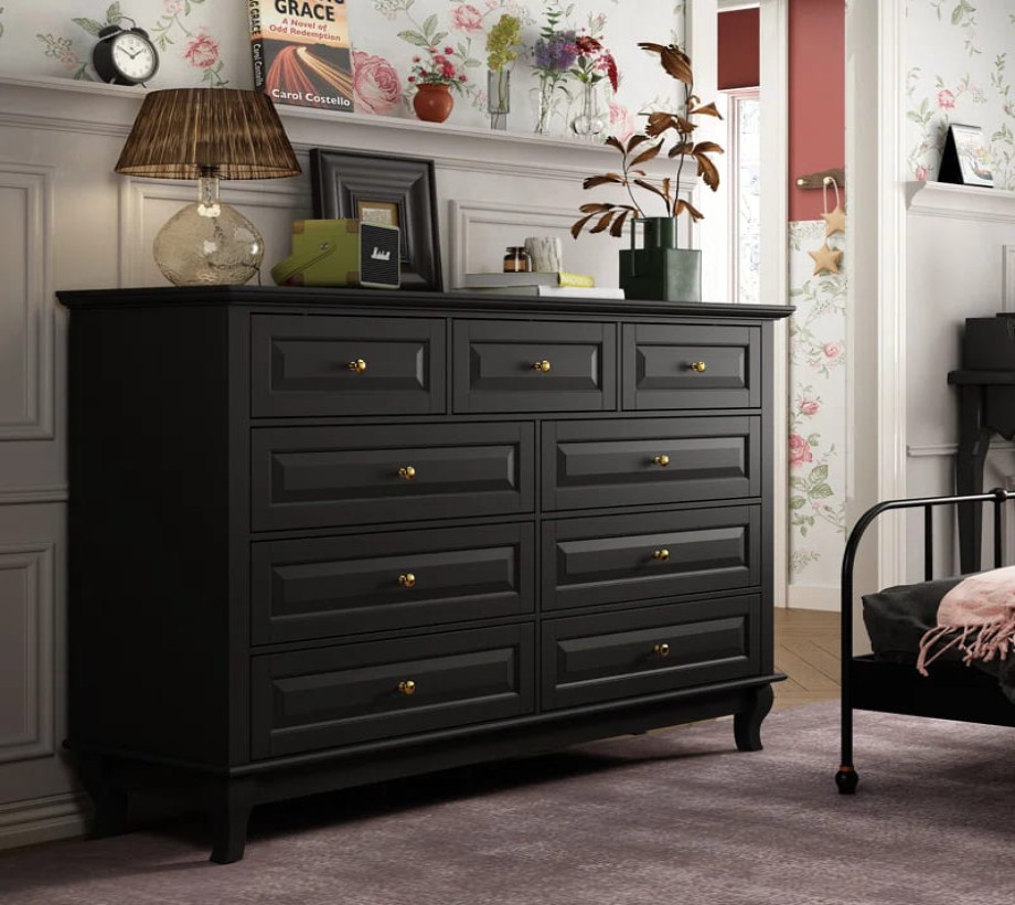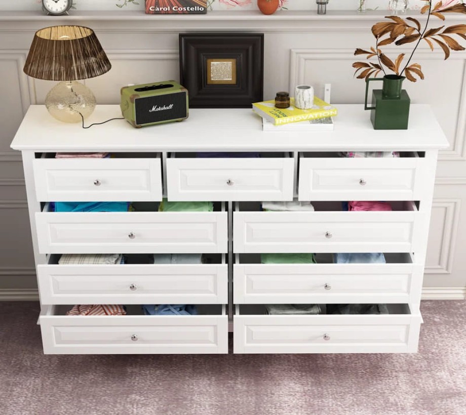 وحدة الأدراج تتميز بتصميم عملي وأنيق مع مقاسات دقيقة تبلغ عرض 140 سم، عمق 40 سم، وارتفاع 95 سم. تحتوي الوحدة على تسعة أدراج موزعة على أربعة صفوف. الصف العلوي يضم ثلاثة أدراج صغيرة، في حين تضم الصفوف الوسطى والسفلي درجين كبيرين لكل منهم. مقابض الأدراج مصنوعة من المعدن الفضي أو الذهبي، مما يعزز التصميم العصري والجذاب للوحدة.