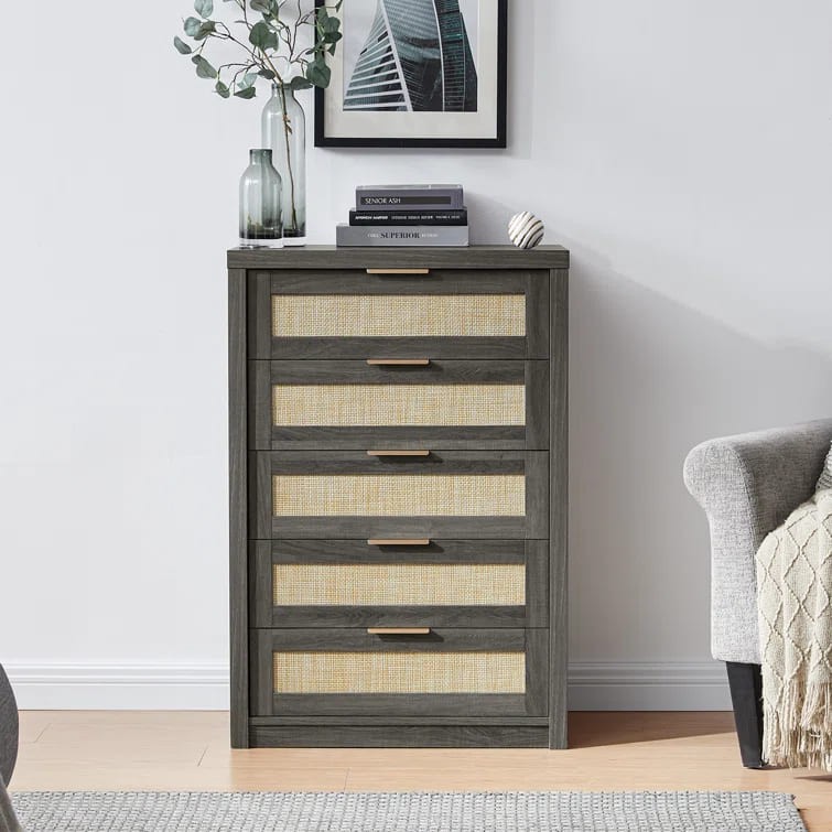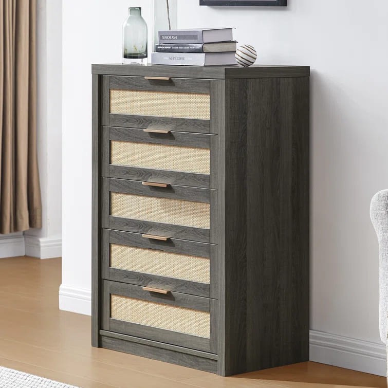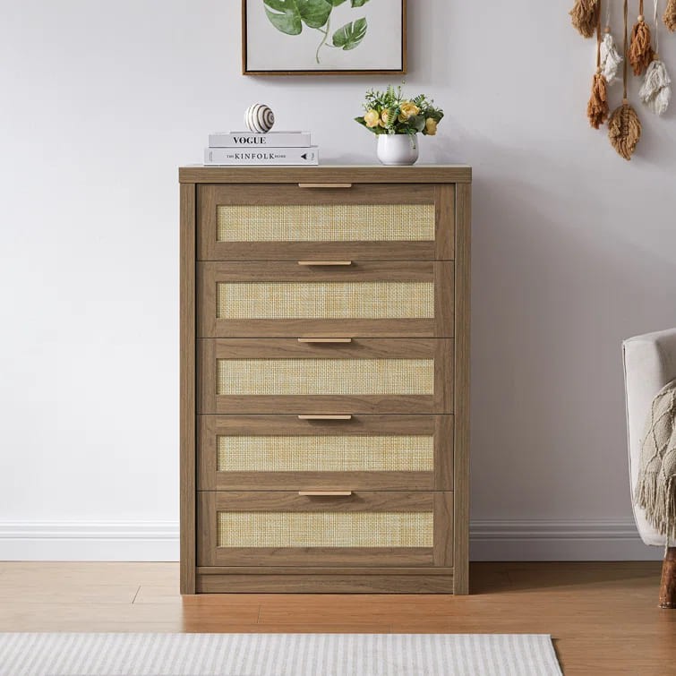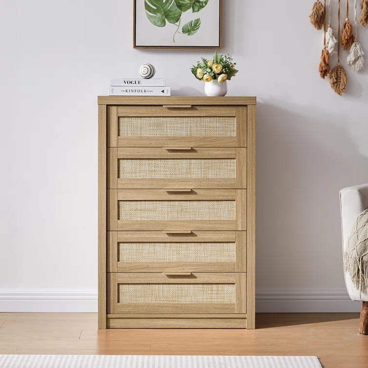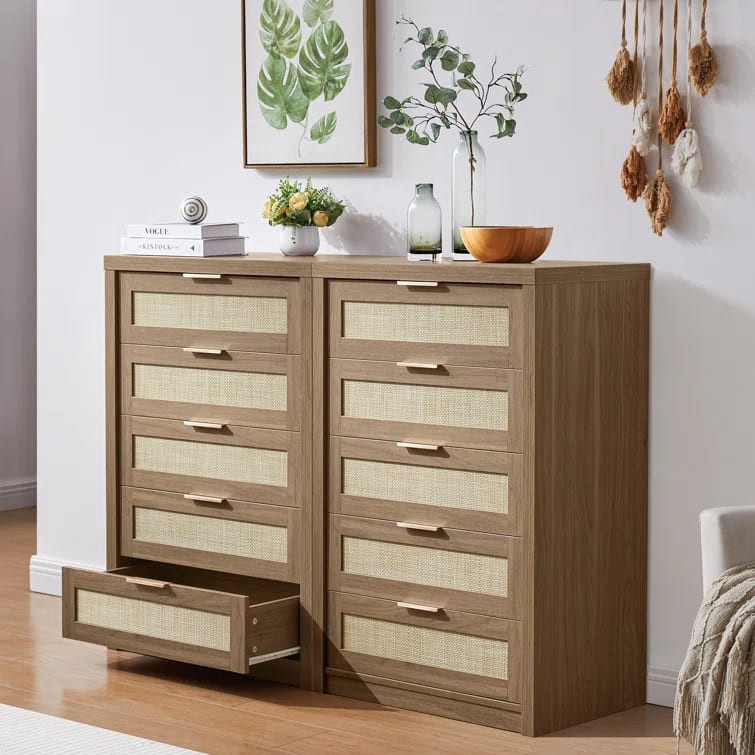 واجهة الأدراج مصنوعة من الروطان تتميز بتصميم شبكي بسيط ولون بيج يكمل مظهر الخشب.