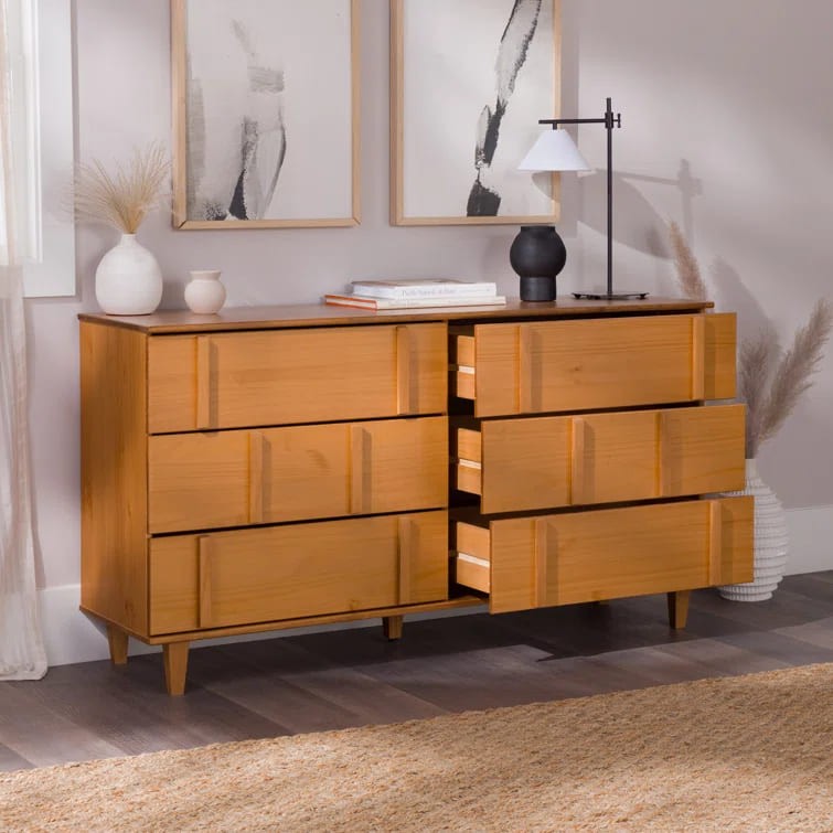 وحدة الأدراج مصنوعة من الخشب الممتاز بلون بني داكن أو لون خشبي، تتميز بوجود ستة أدراج موزعة على صفين أفقيين. لكل درج مقابض خشبية بارزة بتصميم مستطيل عمودي، مما يضيف لمسة عصرية.