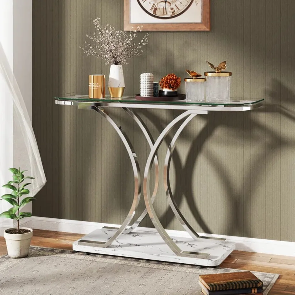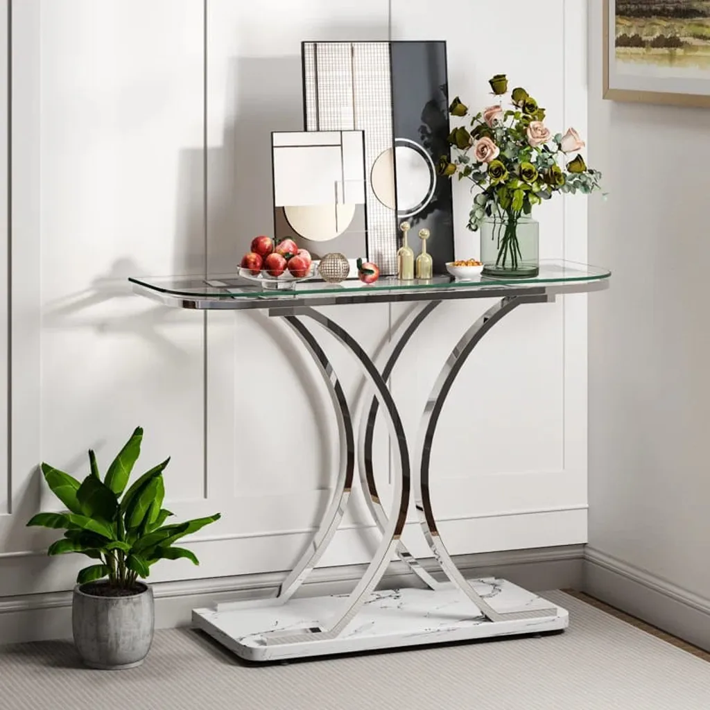 يتميز هذا الكونسول العصري الأنيق بتصميم يجمع بين الفخامة والعملية، مما يجعله إضافة رائعة لأي مساحة حديثة. يأتي بسطح مستطيل مصنوع من الزجاج الشفاف عالي الجودة، مما يمنحه مظهرًا أنيقًا وانسيابيًا يعكس الإضاءة بشكل جميل. تضيف الحواف الفضية اللامعة لمسة من التألق، بينما توفر الأرجل المعدنية بتصميم منحني مزدوج على شكل "X" باللون الفضي ثباتًا وأناقة عصرية.