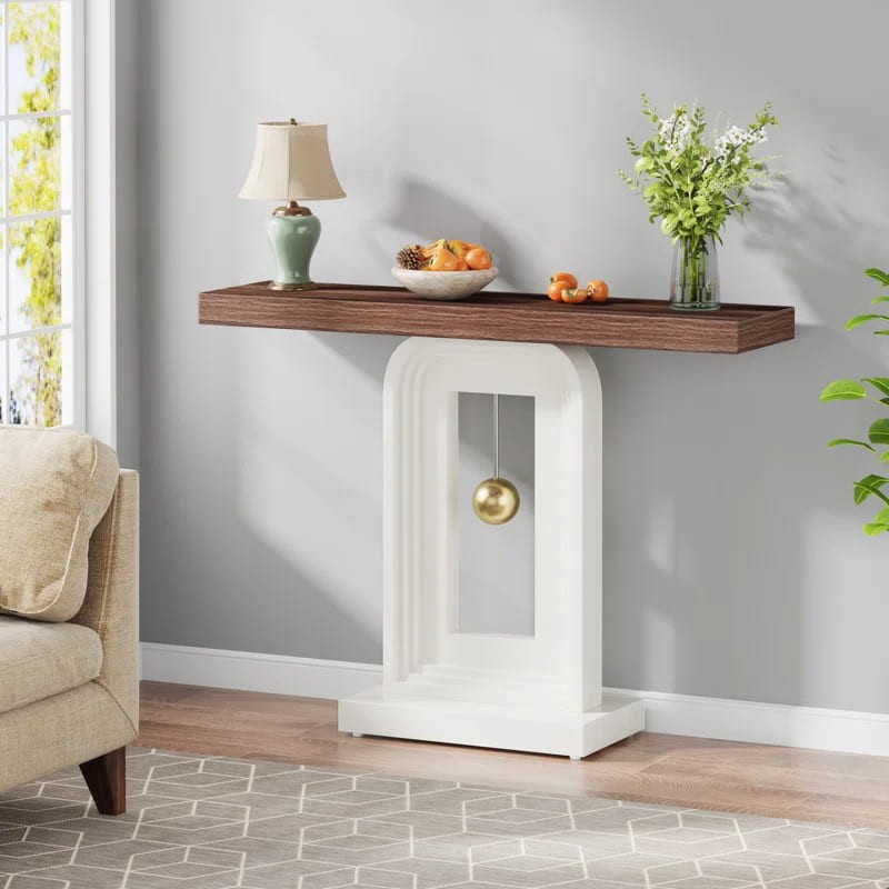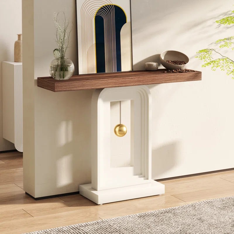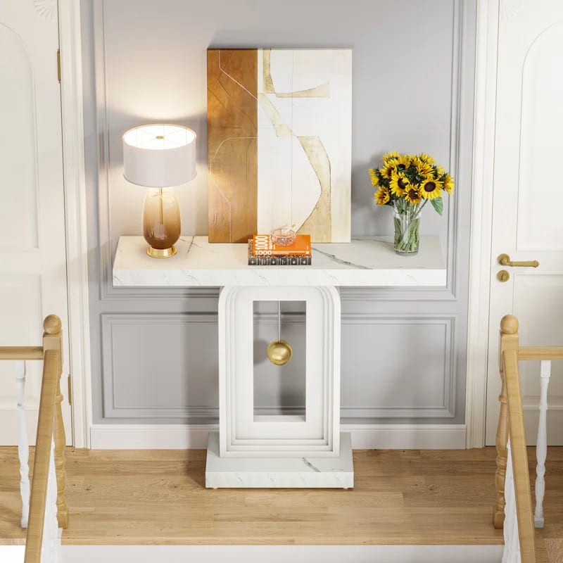 يتميز هذا الكونسول العصري بتصميم أنيق وفاخر يجمع بين الخشب بنمط الرخام الأبيض مع عروق رمادية خفيفة، مما يمنحه مظهرًا مميزًا يناسب مختلف أنماط الديكور الحديثة. يمكن أن يأتي السطح بلون بني داكن، مما يضيف لمسة من الدفء والأناقة. التصميم البسيط يتضمن قاعدة مستطيلة تدعم السطح الرئيسي للكونسول، مع إطار مستطيل مفتوح في المنتصف يحتوي على كرة ذهبية معلقة تضيف لمسة تصميمية مبتكرة.