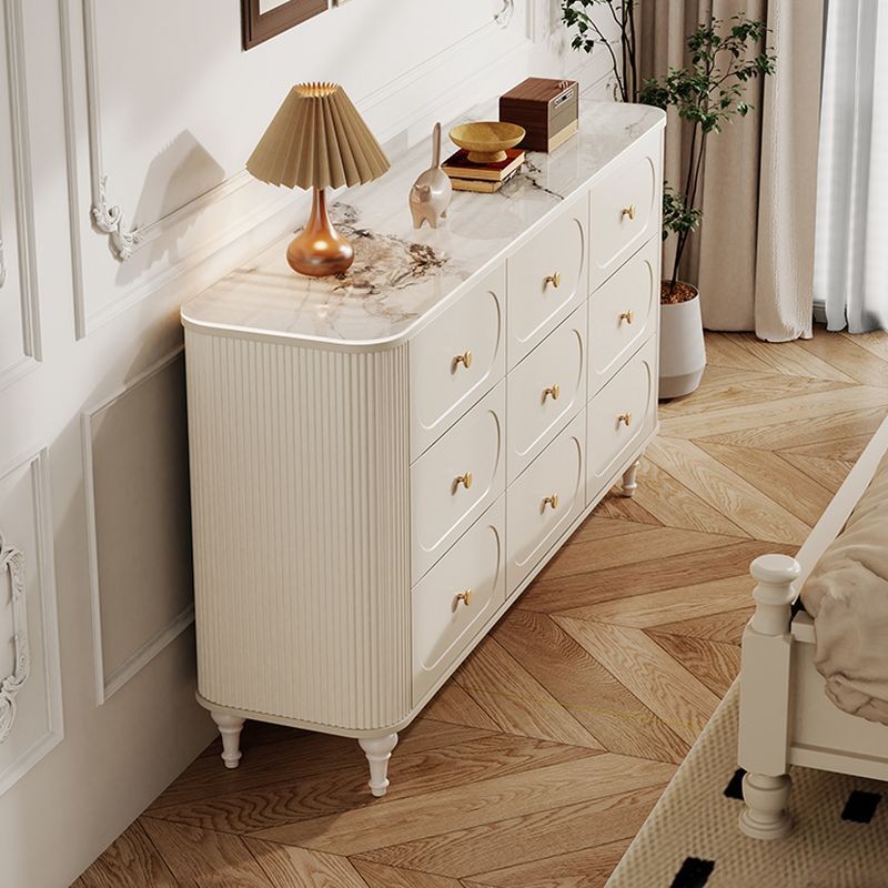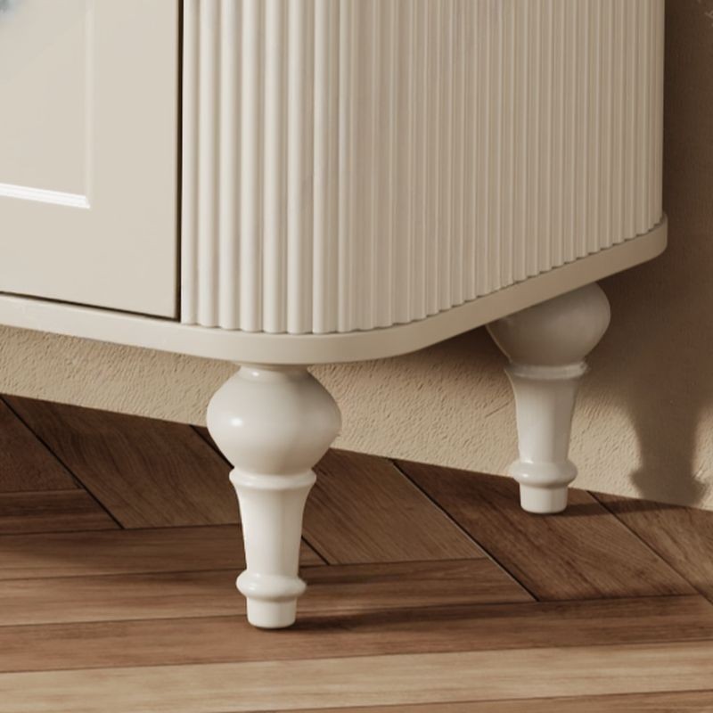 تتزين الأدراج بمقابض معدنية ذات لون ذهبي لامع، تضيف لمسة من الفخامة والتألق إلى التصميم. الوحدة مدعومة بـ4 أرجل قصيرة مزخرفة بنفس اللون الأبيض الكريمي، مما يضمن الثبات ويكمل الطابع الكلاسيكي الحديث.