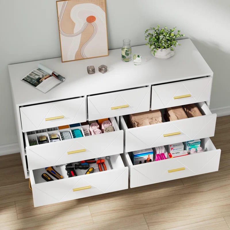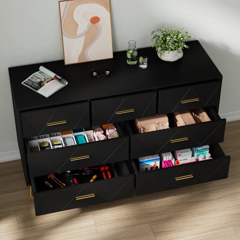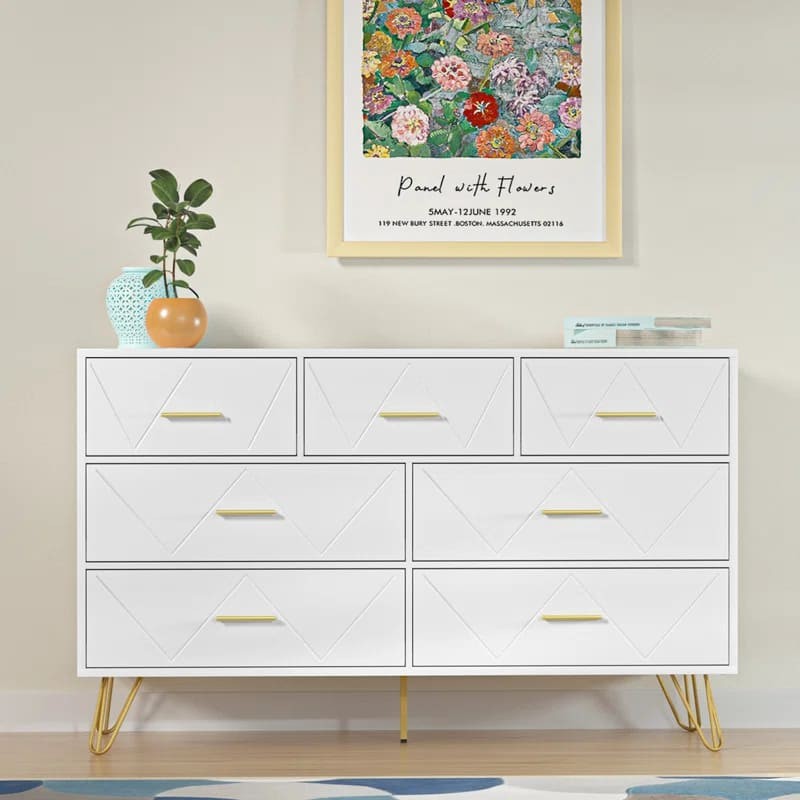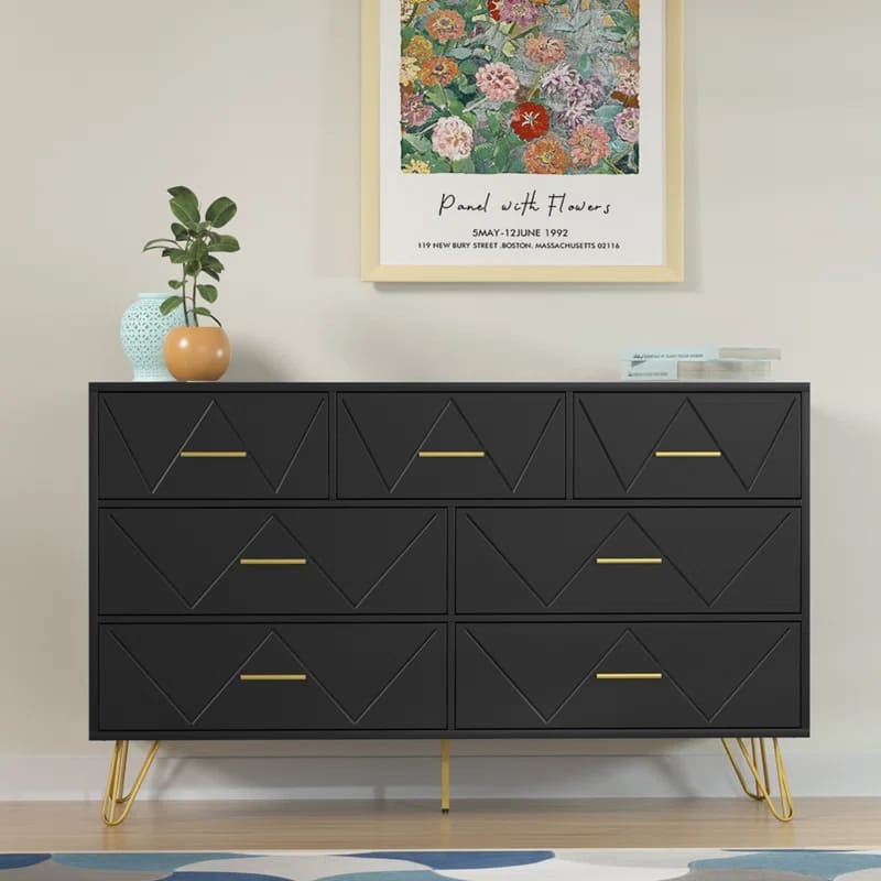وحدة أدراج أنيقة وعملية مصنوعة من الخشب المتين، متوفرة باللون الأسود غير اللامع واللون الأبيض الكلاسيكي. مزودة بسبعة أدراج واسعة توفر مساحة تخزين مثالية. يتميز تصميم الأدراج بزخرفة هندسية بشكل حرف "V" تضيف لمسة فريدة، مع مقابض معدنية باللون الذهبي لإضفاء طابع فاخر. ترتكز الوحدة على أرجل معدنية رفيعة باللون الذهبي تمنحها ثباتًا وأناقة.