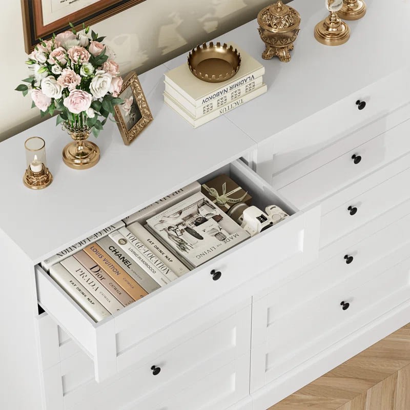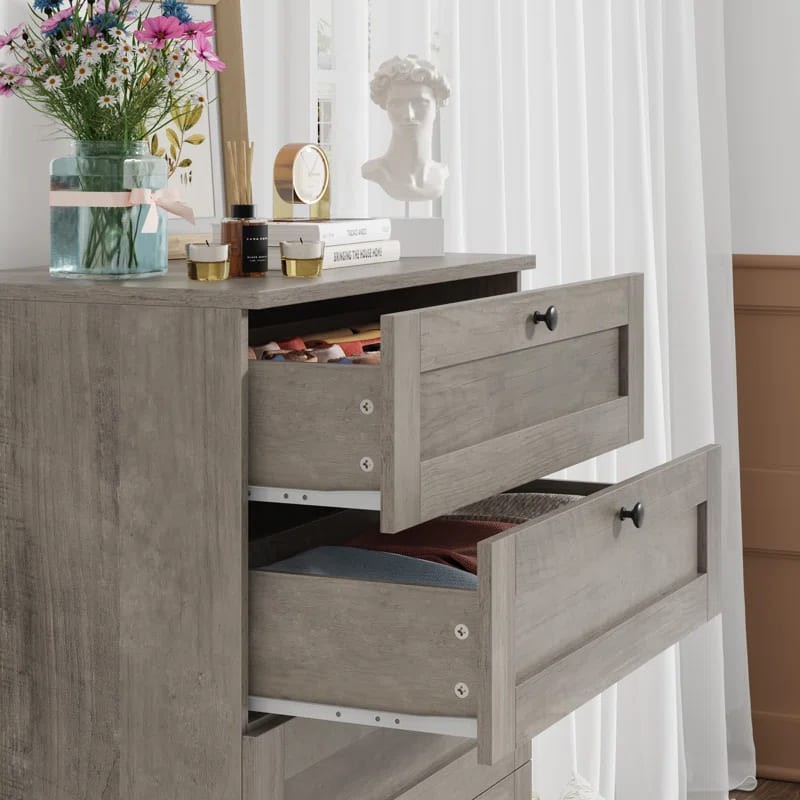 تأتي بتشطيب عالي الجودة بلونين أنيقين هما الأبيض الكلاسيكي والرمادي العصري، مما يضمن تناسقها مع مختلف أنماط الديكور. تُبرز مقابضها الدائرية السوداء المصنوعة بدقة، والمثبتة في منتصف كل درج، لمسة من التباين الجذاب الذي يُكمل جمالية التصميم.