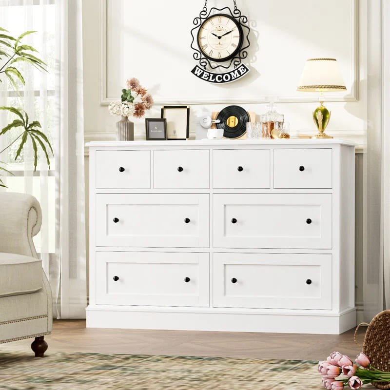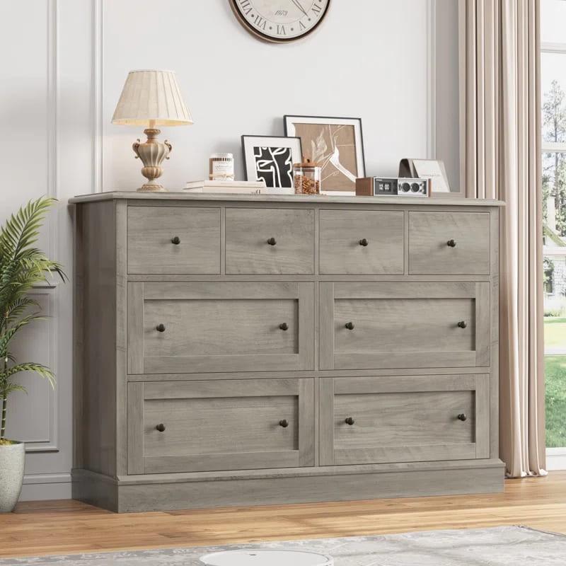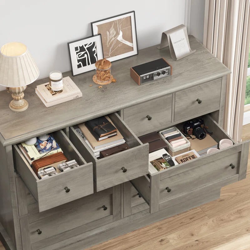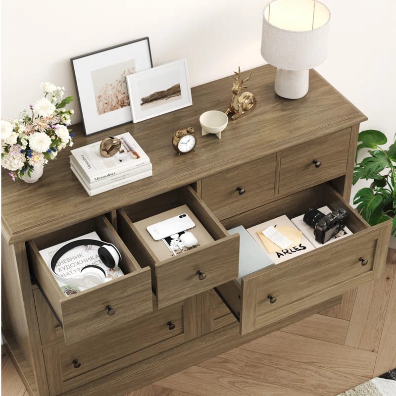 وحدة أدراج عصرية ومميزة مصنوعة من خشب عالي الجودة لضمان المتانة والجمال. تتميز الوحدة بتصميم عملي يضم ثمانية أدراج موزعة على ثلاثة صفوف. يحتوي الصف العلوي على ثلاثة أدراج صغيرة، مثالية للأغراض الصغيرة والإكسسوارات، بينما يحتوي الصفان الأوسط والسفلي على أربعة أدراج أكبر حجمًا لتخزين الملابس أو الأغراض الشخصية بشكل منظم وفعال.