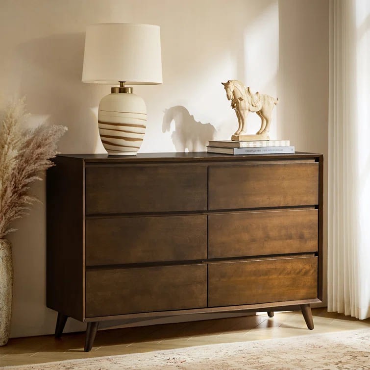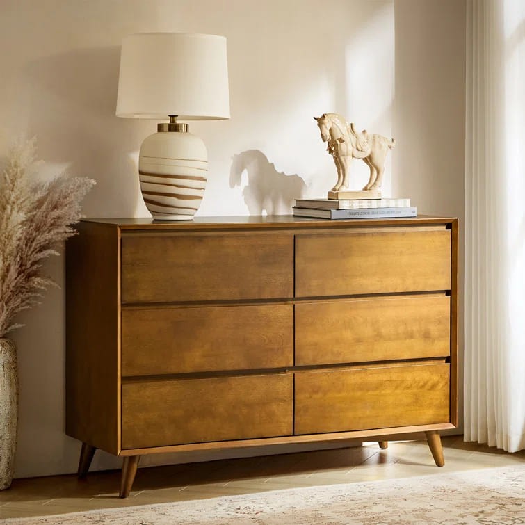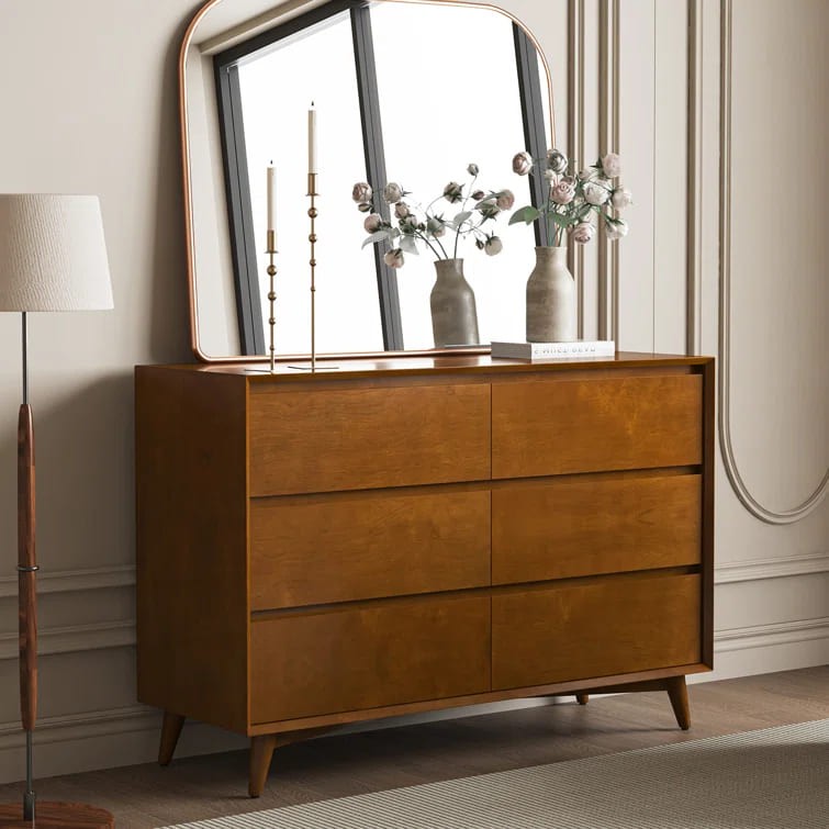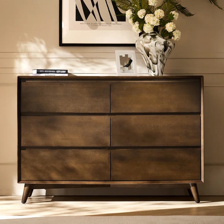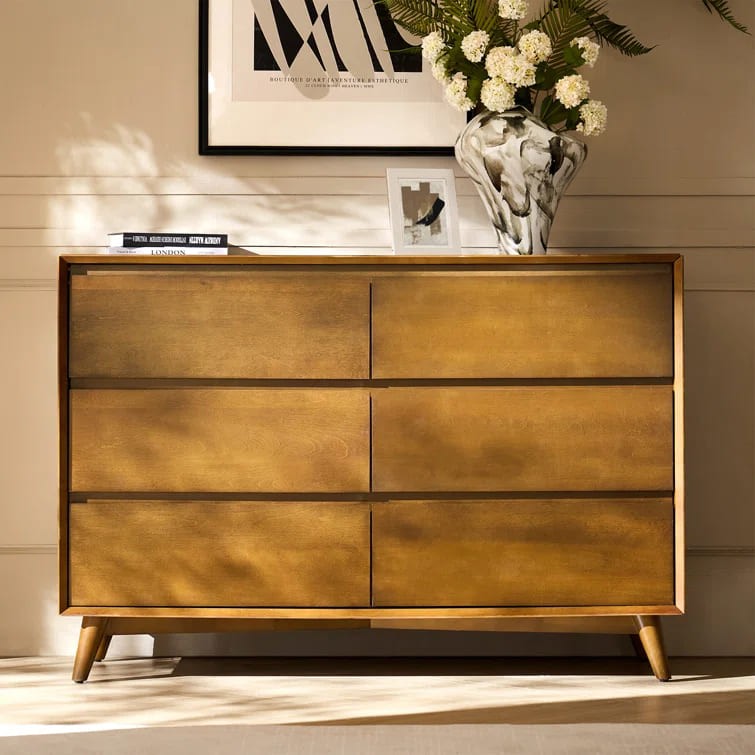 وحدة أدراج خشبية عصرية بتصميم مميز، مصنوعة من خشب عالي الجودة لضمان المتانة والجمال الطبيعي. تحتوي هذه الوحدة على ستة أدراج متساوية الحجم، توفر مساحة تخزين واسعة ومنظمة تساعد في ترتيب الأغراض الشخصية بفعالية.
