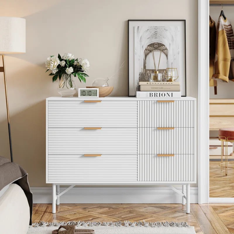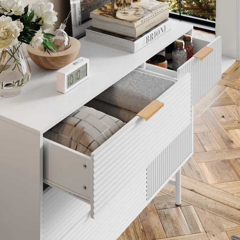 وحدة أدراج عصرية وأنيقة، مصنوعة من خشب عالي الجودة لضمان المتانة والجمال الفريد. تتميز الوحدة باللون الأبيض الناصع، مع خطوط طولية بارزة على واجهة الأدراج تضيف لمسة جمالية حديثة ومميزة. تضم الوحدة ستة أدراج متنوعة الأحجام لتلبية احتياجات التخزين المختلفة، مما يجعلها مثالية لتنظيم الأغراض الشخصية أو المنزلية بفعالية.