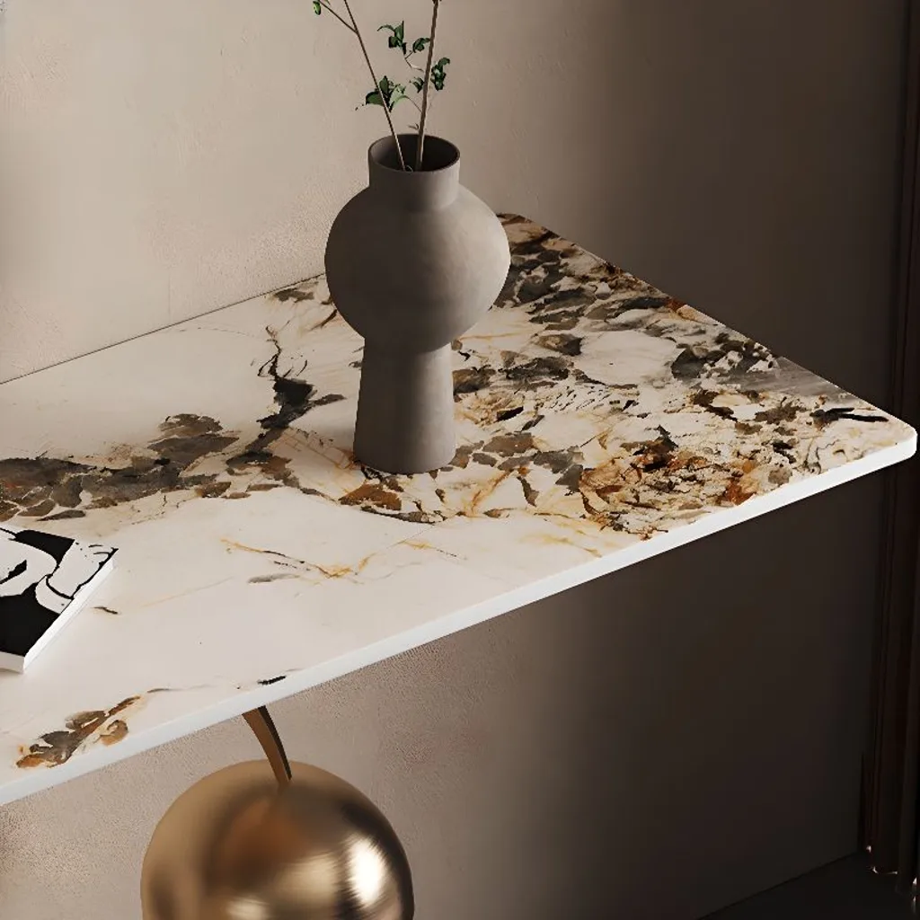 يتميز هذا الكونسول العصري بسطح طاولة مصنوع من الرخام الفاخر بتدرجات الأبيض والبني مع عروق طبيعية تضفي طابعًا فريدًا ومميزًا. القاعدة مصنوعة من المعدن الذهبي بتصميم منحني مبتكر يحتوي على عنصر كروي يبرز جمال التفاصيل ويضفي لمسة من الفخامة والأناقة.