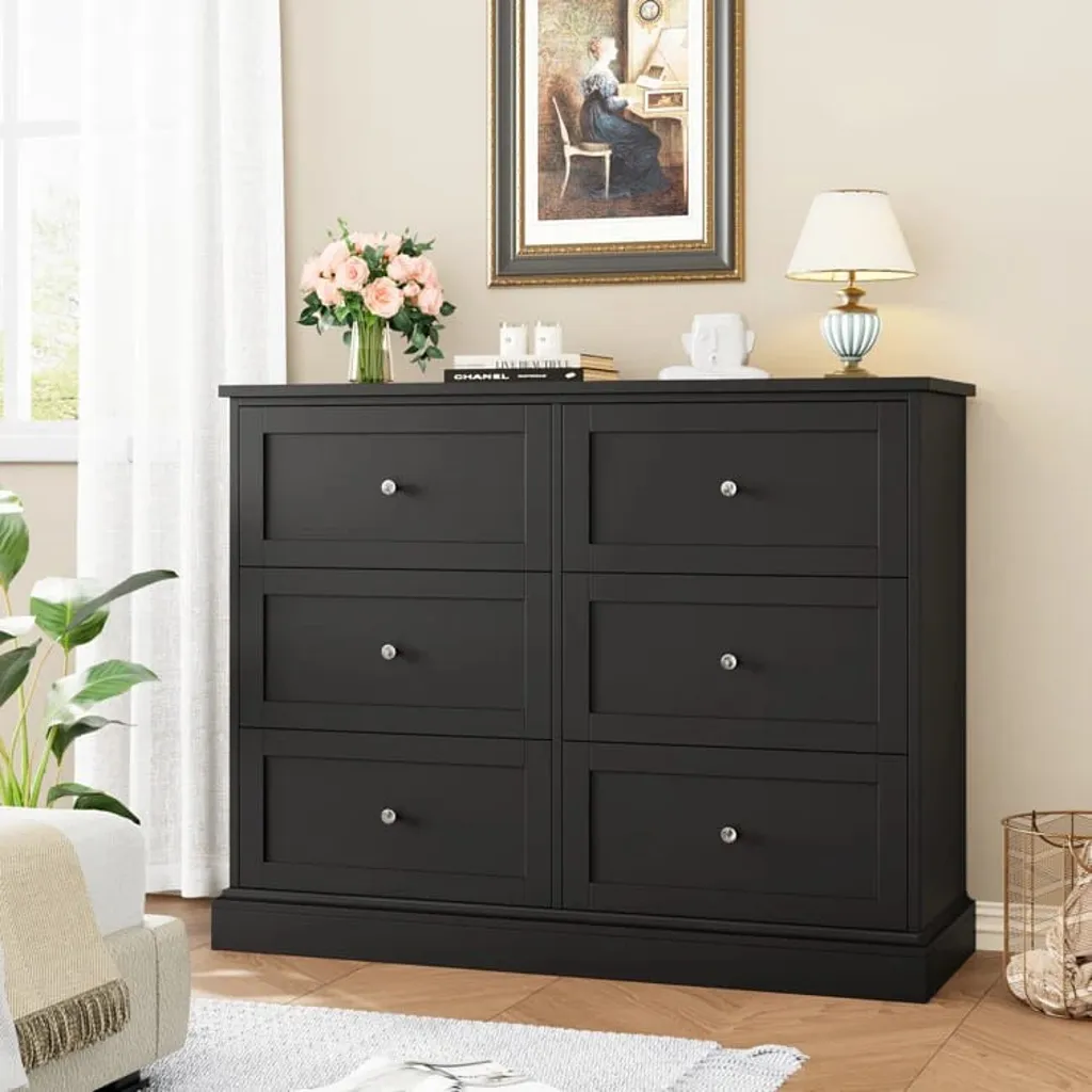 تتميز الوحدة بتصميمها الأنيق مع مقابض دائرية سوداء تضفي لمسة من التباين العصري على التصميم. تحتوي على ستة أدراج واسعة موزعة على صفين أفقيين، مما يوفر مساحة تخزين كبيرة ومنظمة تناسب الاحتياجات المختلفة.