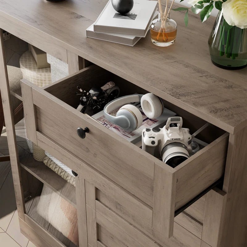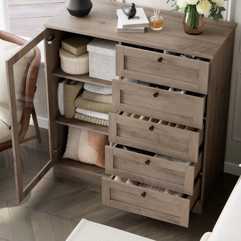 أدراج متعددة: تحتوي على خمسة أدراج مصممة بشكل متقن على الجانب الأيمن، جميعها مزودة بمقابض دائرية سوداء لضمان سهولة الاستخدام.