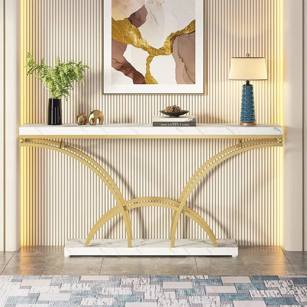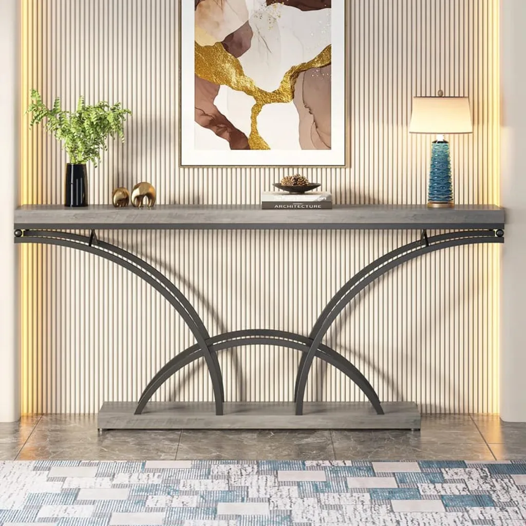 الكونسول العصري يتميز بتصميم أنيق يجمع بين الخشب والمعدن. يأتي بسطح خشبي واسع باللون الرمادي وأبعاد تقريبية: عرض 150 سم، عمق 35 سم، ارتفاع 80 سم. الإطار المعدني الأسود يتميز بتصميم بأقواس متقاطعة تضفي لمسة إبداعية. يتناغم اللون الرمادي مع الإطار الأسود ليوفر مظهراً عصرياً ومميزاً.