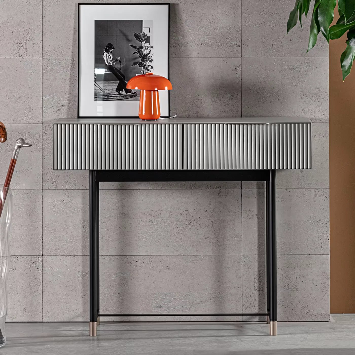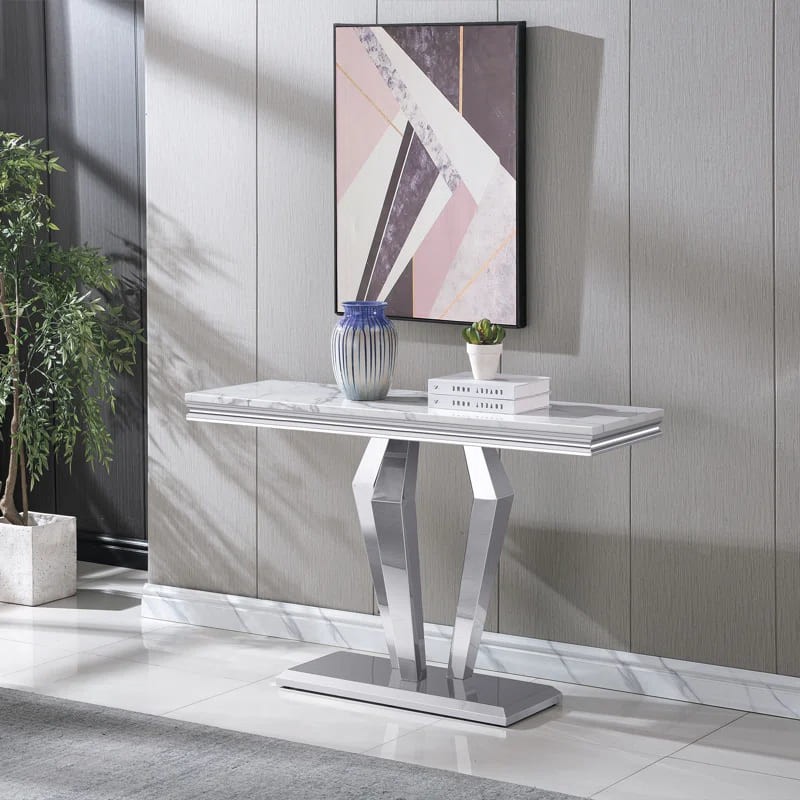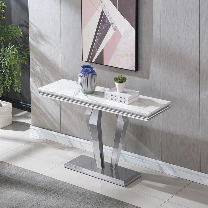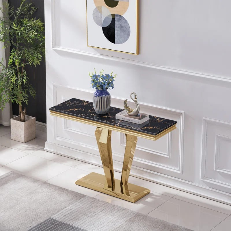 كونسول بتصميم فاخر وعصري يتناسب مع جميع المساحات الداخلية، يجمع بين الأناقة والعملية. سطحه مصنوع من الرخام الأبيض المميز بنقوش طبيعية، ليضفي لمسة راقية وأنيقة، ويمكن أن يتوفر بخيار الرخام الأسود مع نقوش ذهبية طبيعية، ليزيد من الفخامة والجمال. القاعدة مصنوعة من المعدن الذهبي المصقول بتصميم هندسي فريد يدعم الهيكل ويعزز الفخامة، مع خيار إضافي للقاعدة بلون فضي لمن يفضل الطابع العصري الهادئ.