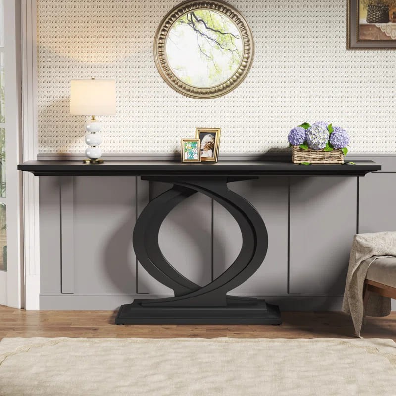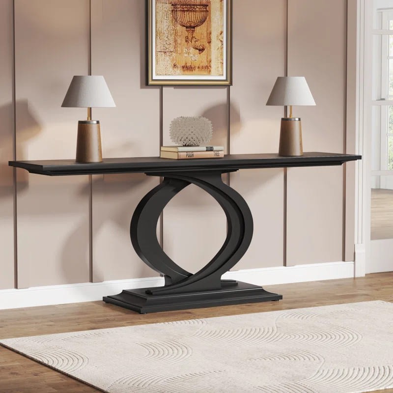 كونسول أنيق ومعاصر يتميز بتصميم جذاب يضيف لمسة فريدة للمساحات الداخلية. مصنوع من الخشب بجودة عالية، ويأتي بلون أبيض نقي يمنح مظهراً ناعماً وعصرياً، أو باللون الأسود الأنيق ليبرز الطابع الحديث والجريء. يعزز التصميم البسيط والعملي خطوط الكونسول، بينما تتميز القاعدة بتصميم مبتكر على شكل حلقات متداخلة تضيف طابعاً فنياً مميزاً.