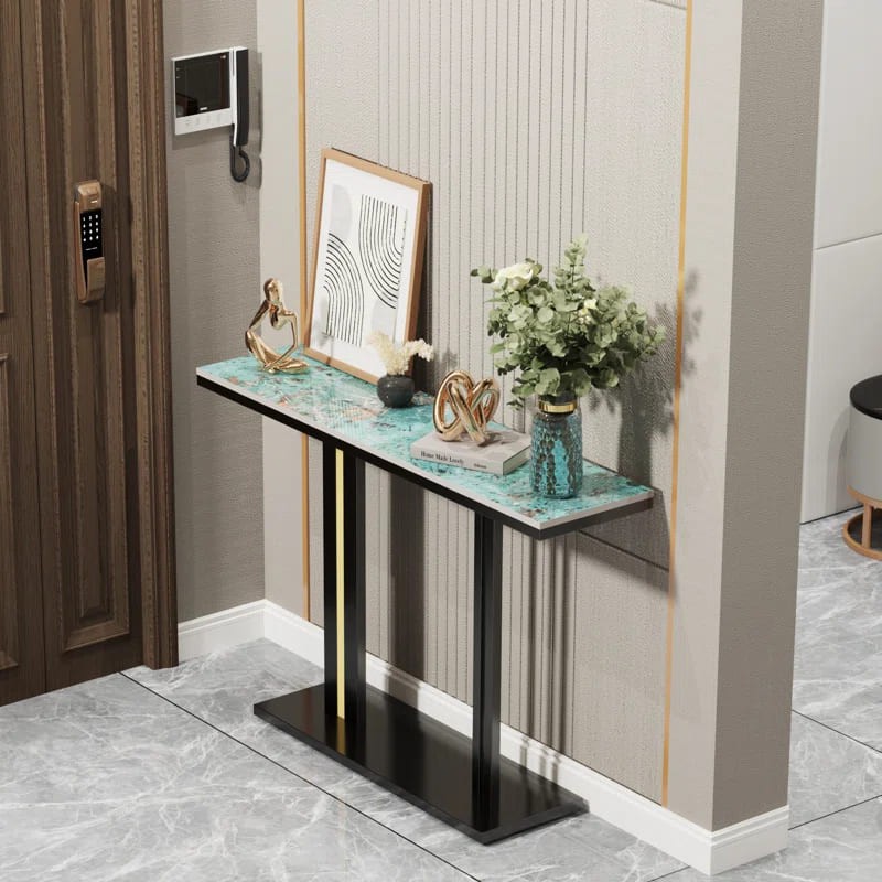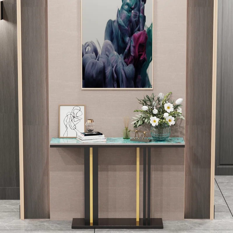 يتميز هذا الكونسول بسطح فاخر من الرخام الأخضر الذي يضفي لمسة راقية وفريدة من نوعها، أو من الرخام الأبيض الذي يعكس جمال الفخامة والرقي. القاعدة مصنوعة من المعدن بلون أسود متين ومزودة بتفاصيل ذهبية دقيقة، تضيف لمسة عصرية وجذابة للتصميم.