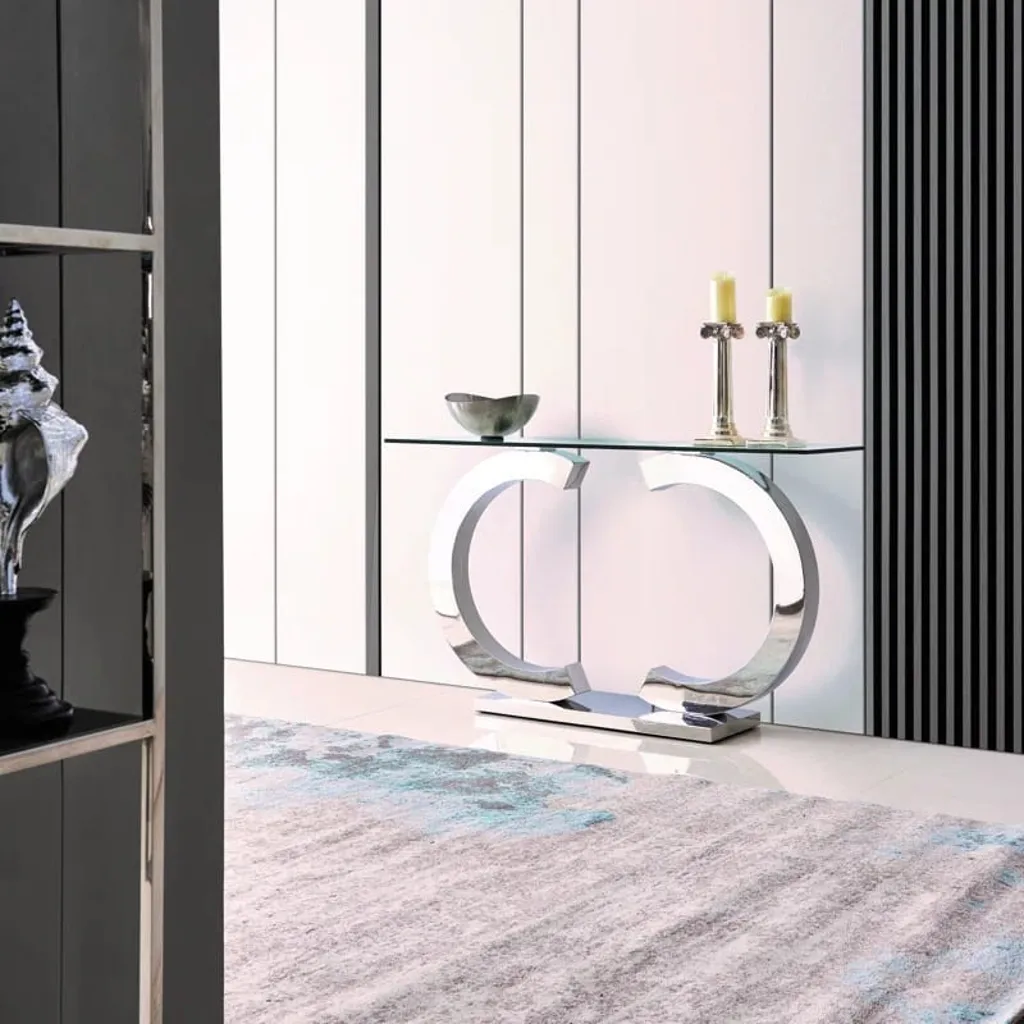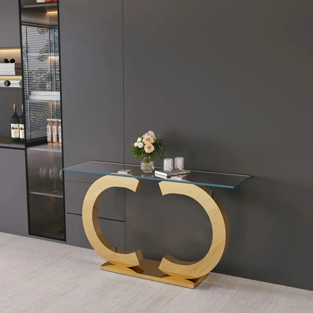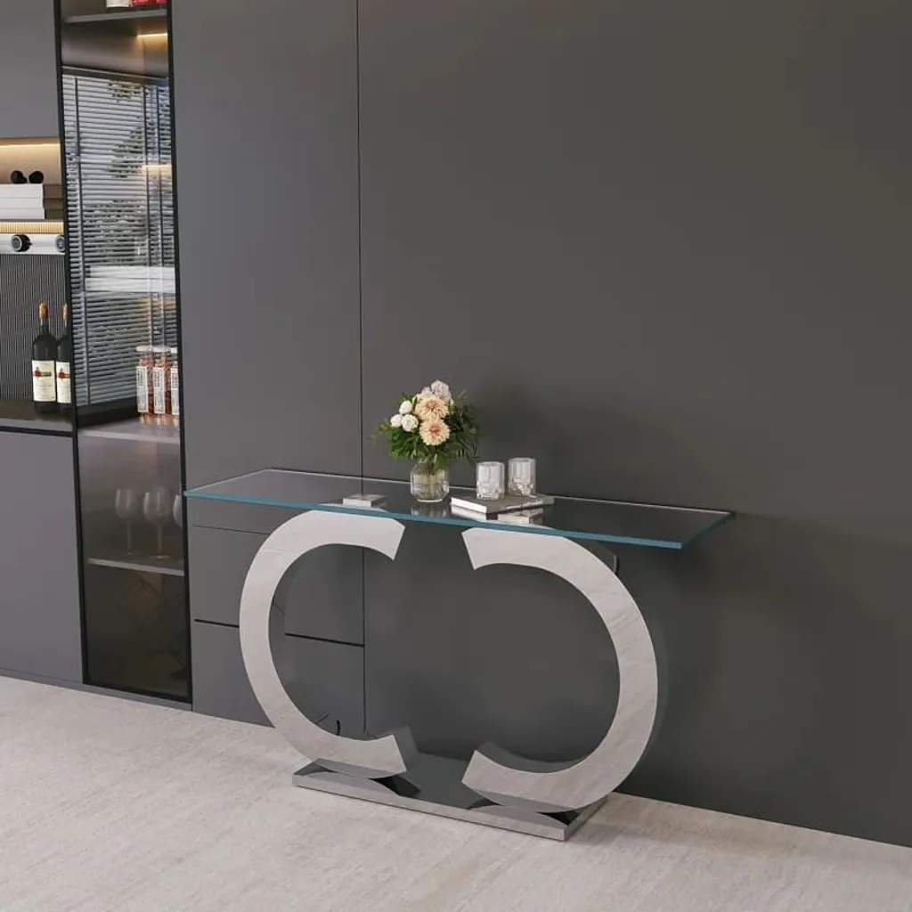 يتميز هذا الكونسول العصري بقاعدة معدنية مذهلة متوفرة بلون ذهبي أو فضي بتصميم فريد على شكل حرف "C" مزدوجة، مما يضيف لمسة أنيقة وعصرية إلى التصميم. السطح مصنوع من الزجاج الشفاف الذي يعكس البساطة والجمال، ويضفي على القطعة إحساساً بالمساحة المفتوحة والحداثة.
