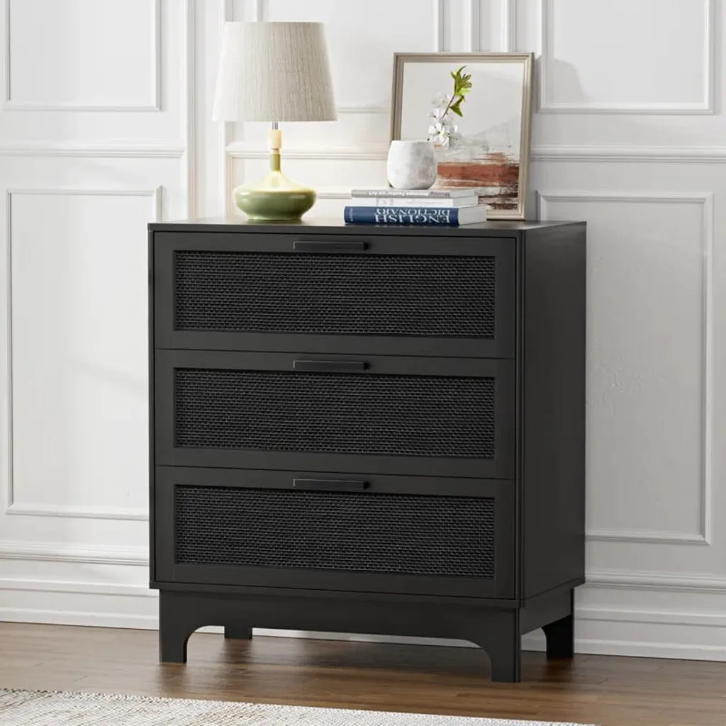 أضف لمسة من الفخامة العصرية إلى غرفتك مع هذه وحدة الأدراج المصنوعة من الخشب والمغطاة بتفاصيل راتان راقية. تجمع هذه الخزانة بين المظهر الحديث والمتانة، وتوفر ثلاث أدراج واسعة لتخزين الملابس والأغراض الشخصية بسهولة.