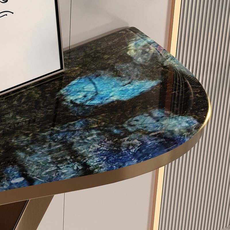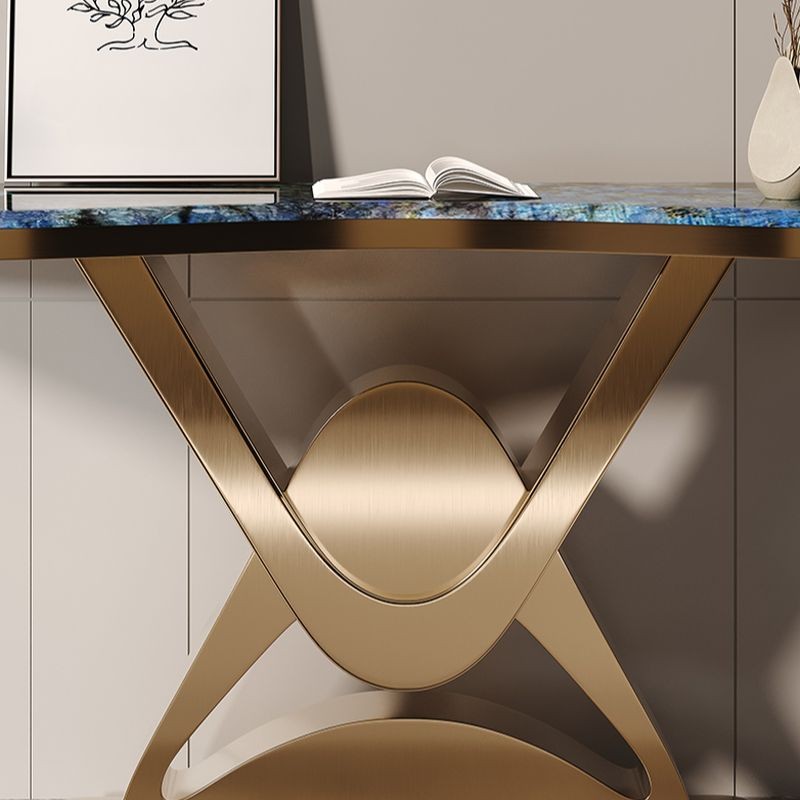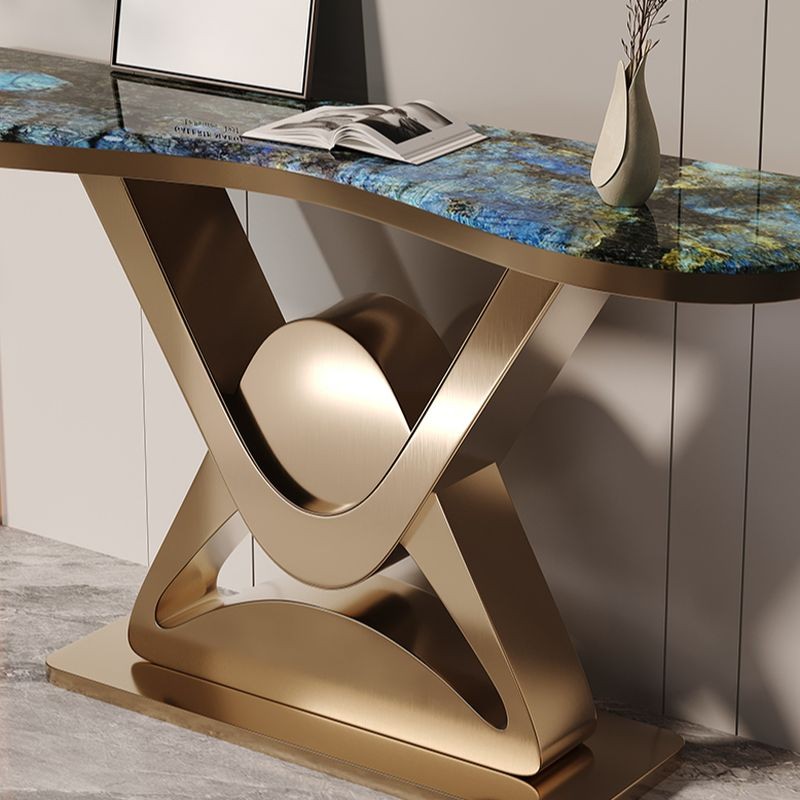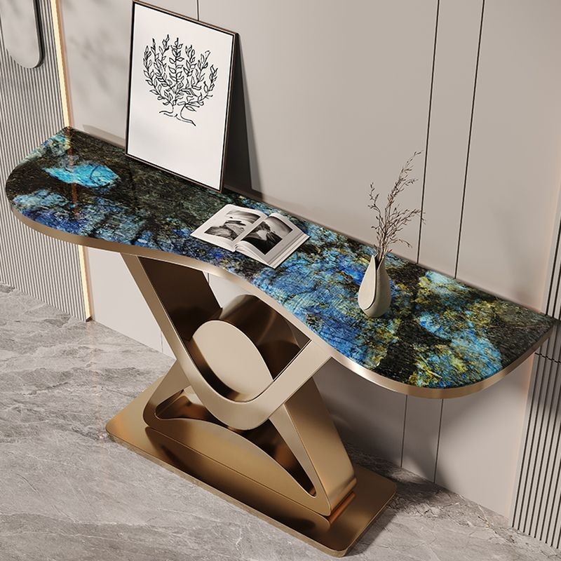 كونسول أنيق بتصميم عصري، مصنوع من المعدن الذهبي بقاعدة منحنية تأخذ شكل حرف "X"، مع عنصر كروي في المركز يضيف لمسة من الفخامة. السطح العلوي يتمتع بشكل متموج وزخارف متعددة الألوان تتراوح بين درجات الأزرق والأخضر، مما يخلق مظهرًا حيويًا وجذابًا.