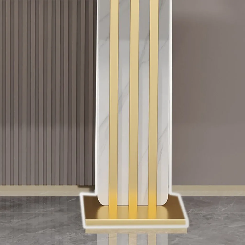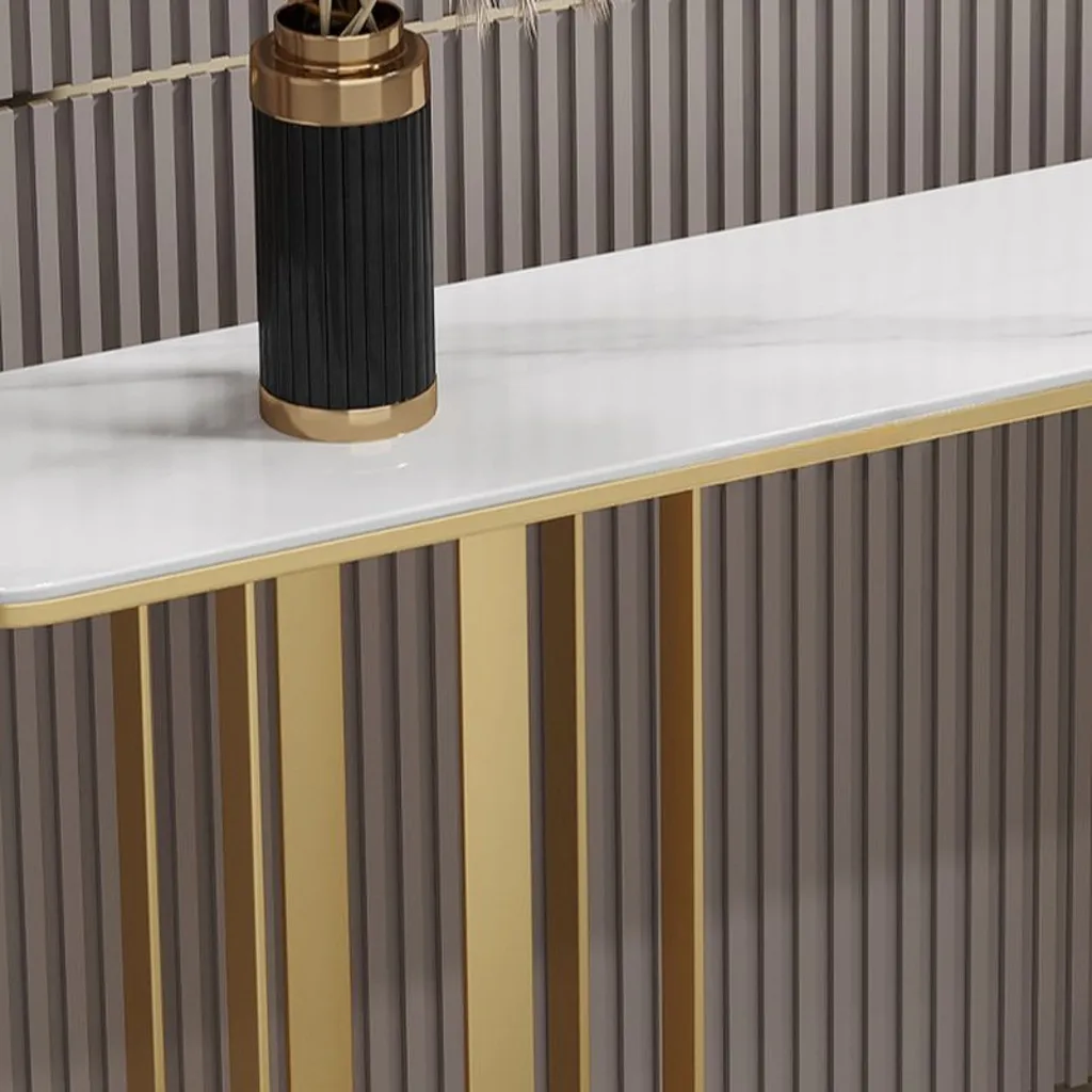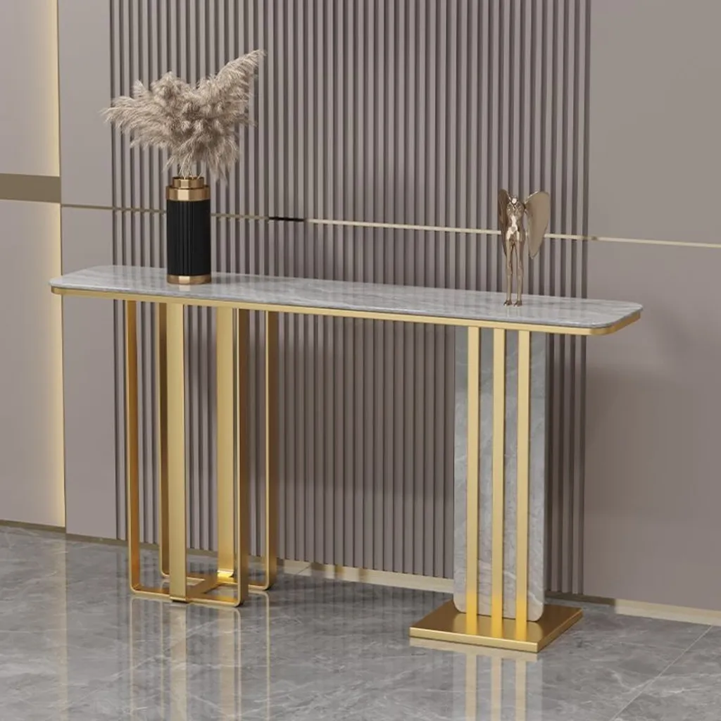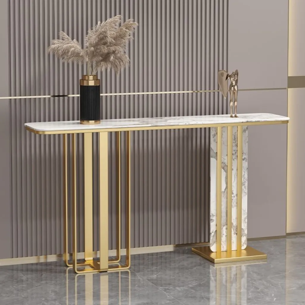 كونسول عصري أنيق مصنوع من الرخام الفاخر، يتميز بتصميم مبتكر وجميل يجمع بين الفخامة والجمال. يشتمل على قاعدة معدنية ذهبية ذات تصميم هندسي فريد، تضيف لمسة من الأناقة والتميز. يتميز الكونسول بالقضبان الذهبية الرأسية التي تمنح القاعدة مظهرًا عصريًا وفاخرًا، مما يعزز من جماله الكلي. سطح الكونسول مصنوع من الرخام الذي يمكن أن يأتي باللون الأبيض، الرمادي، أو الأبيض مع عروق رمادية طبيعية، مما يضفي جاذبية كلاسيكية ومظهراً مميزاً.