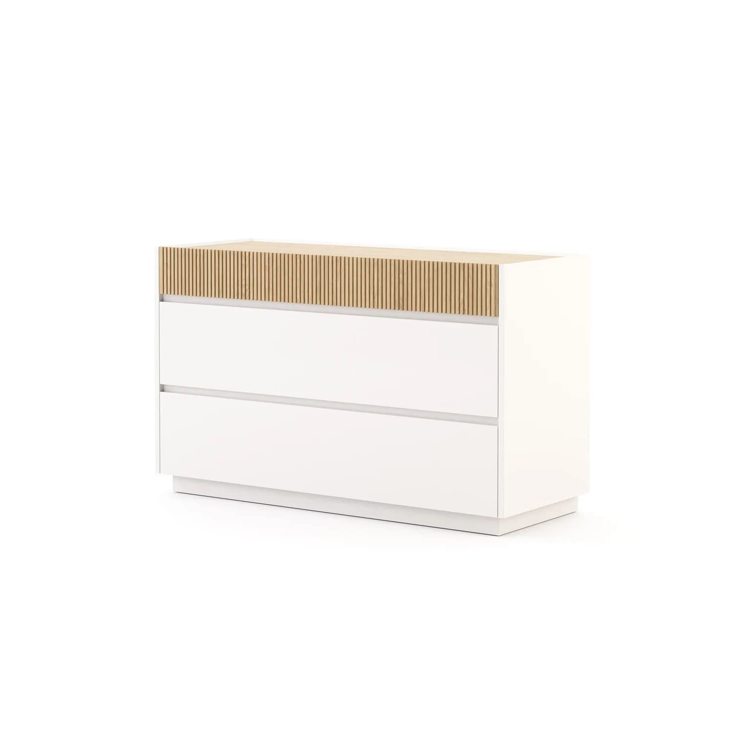وحدة أدراج بتصميم عصري وأنيق، تتميز بهيكل خشبي بلون أبيض ناصع وسطح علوي بلون خشبي فاتح يضفي لمسة دافئة وأنيقة على أي مساحة. تحتوي الوحدة على ثلاثة أدراج كبيرة، حيث يتميز أولها بتصميم شرائح خشبية تضيف لمسة فريدة، بينما يأتي الدرجان الآخران باللون الأبيض النقي. توفر هذه الأدراج مساحة تخزين واسعة ومنظمة للحفاظ على ترتيب الأغراض اليومية.