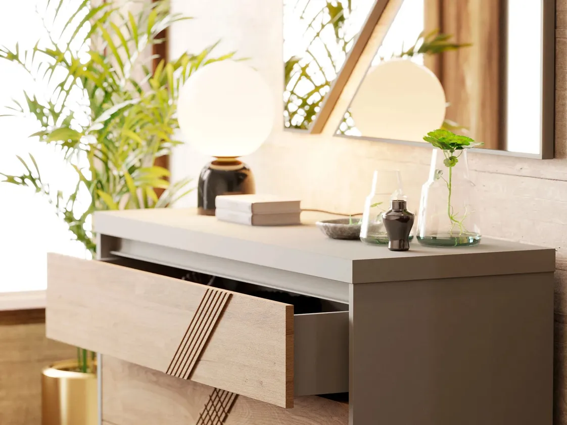 وحدة أدراج بتصميم عصري وأنيق، مصنوعة من الخشب بلون رمادي فاتح مع واجهات أدراج بلون خشبي فاتح تضيف لمسة دافئة وجميلة إلى أي مساحة. تتميز الوحدة بثلاثة أدراج بتصميم مائل محفور، مما يضيف لمسة جمالية وعصرية مع توفير مساحة تخزين منظمة وفعالة للأغراض اليومية. تصميمها الجذاب يجعلها خيارًا مثاليًا لتنظيم المساحات الداخلية مثل المداخل، الممرات، وغرف المعيشة.