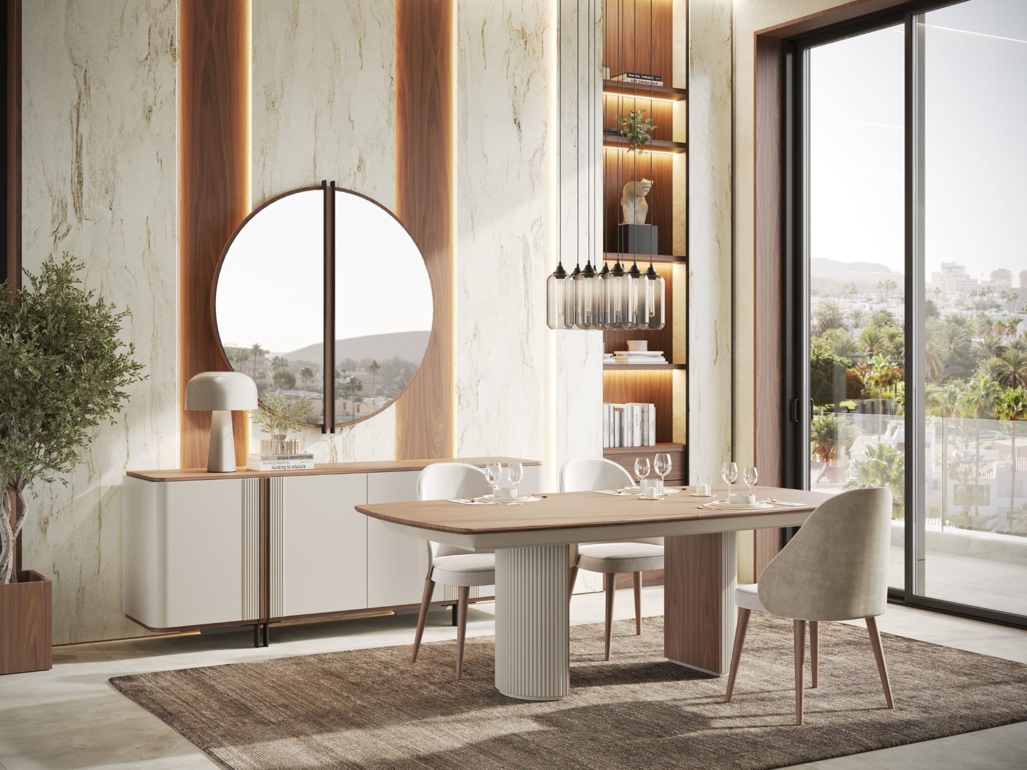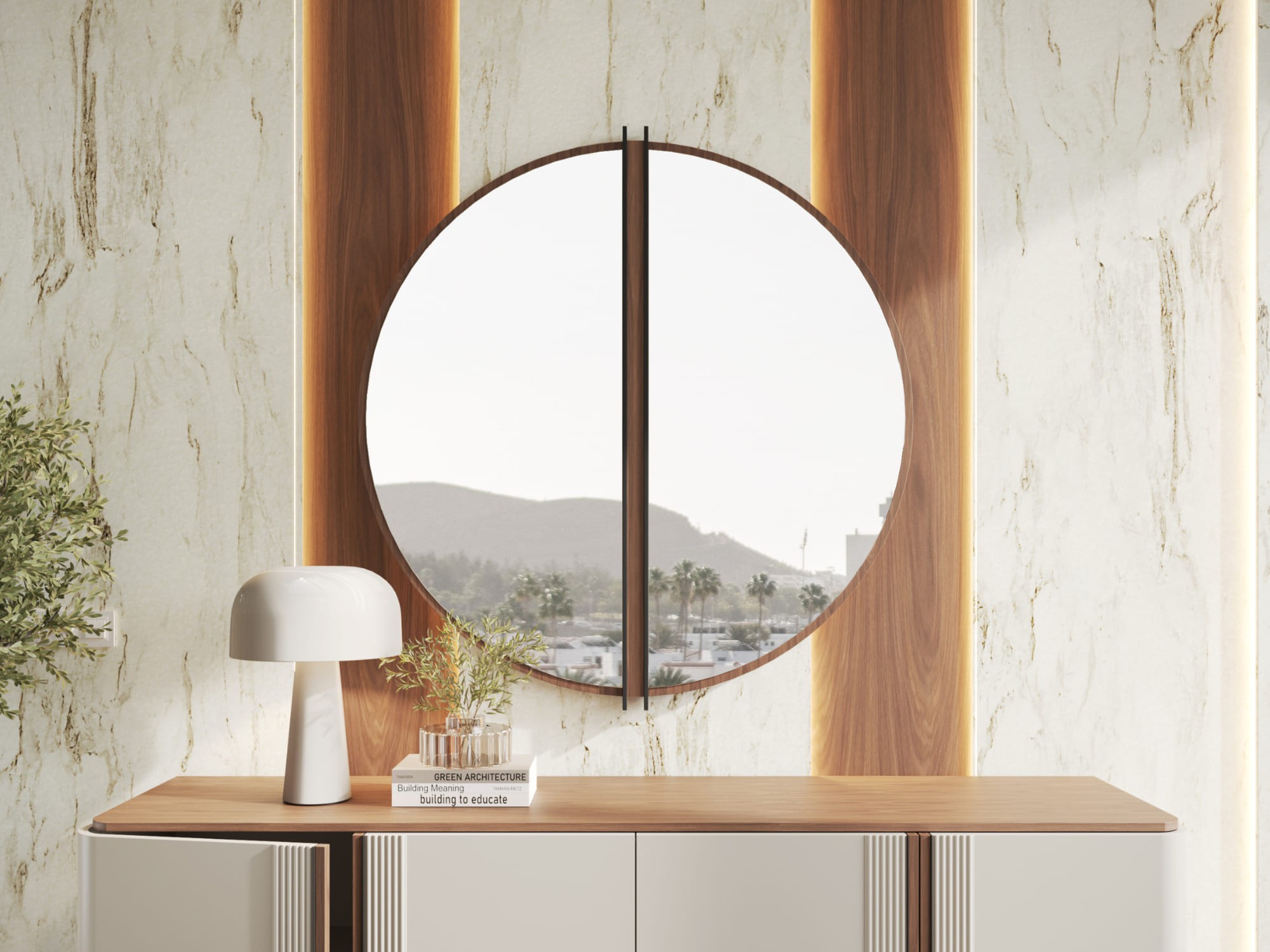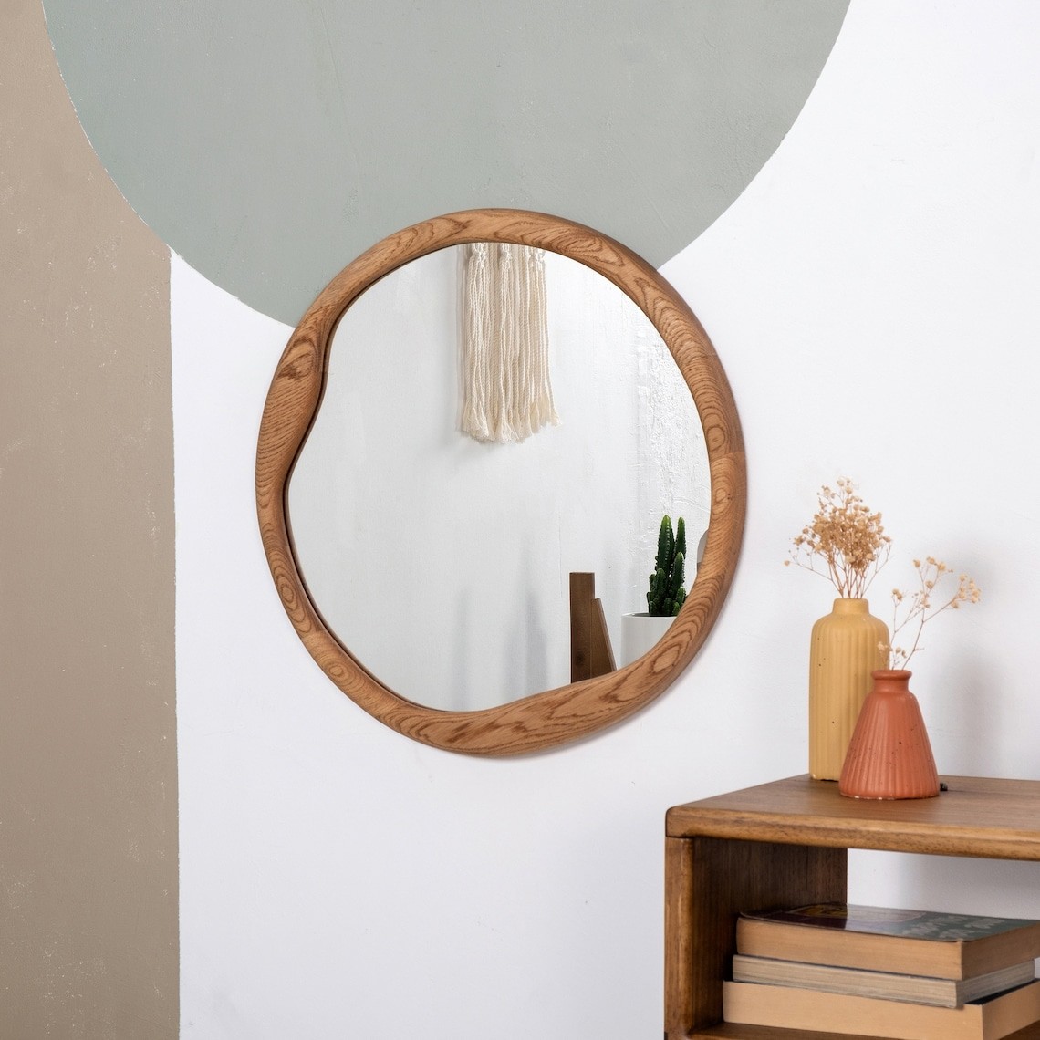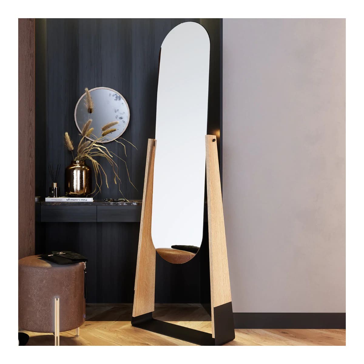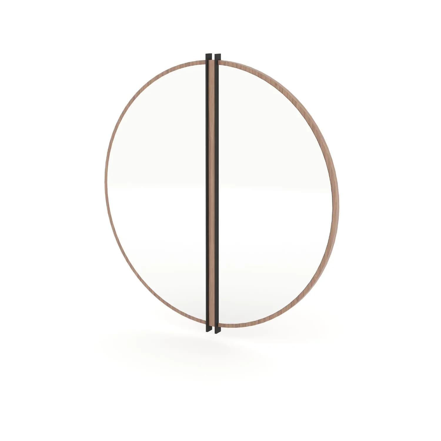 مرآة مستديرة أنيقة وفاخرة، تتميز بإطار خشبي راقٍ مزين بشريط معدني أسود مركزي، مما يضيف لمسة طبيعية ومتطورة على التصميم. التفاصيل الدقيقة في الإطار تعزز من الأناقة وتخلق تباينًا بصريًا جذابًا، بينما يمنح الإطار المحيط بها تناغمًا واستمراريةً مع لمسة نهائية راقية. بقطر 80 سم، تعتبر هذه المرآة مثالية لتعليقها في غرف المعيشة، غرف النوم، أو الممرات، مما يضفي لمسة من الفخامة على أي مساحة داخل المنزل.