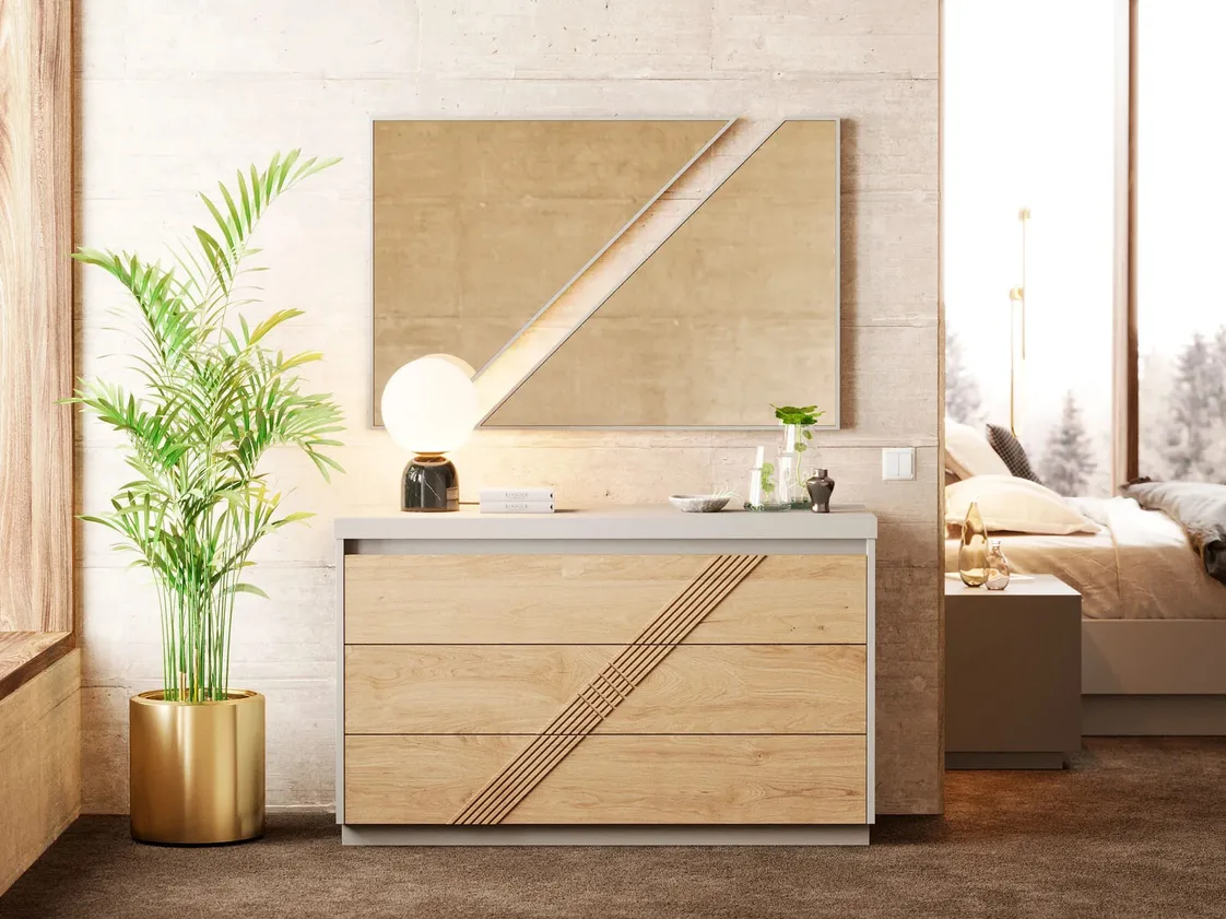 مرآة بإطار خشبي تتميز بتصميم جريء وأصيل يضيف لمسة من الفخامة لأي مساحة. بفضل الأشكال الهندسية المتناسقة، تصبح هذه المرآة عنصرًا فريدًا في ديكور المنزل. تصميمها البسيط والمتناغم يجعلها الخيار المثالي لمختلف الأنماط والمساحات، مما يتيح لك دمجها بسهولة في غرف المعيشة، غرف النوم أو الممرات. تضفي هذه المرآة لمسة من الأناقة والتميّز على أي مساحة داخل المنزل.