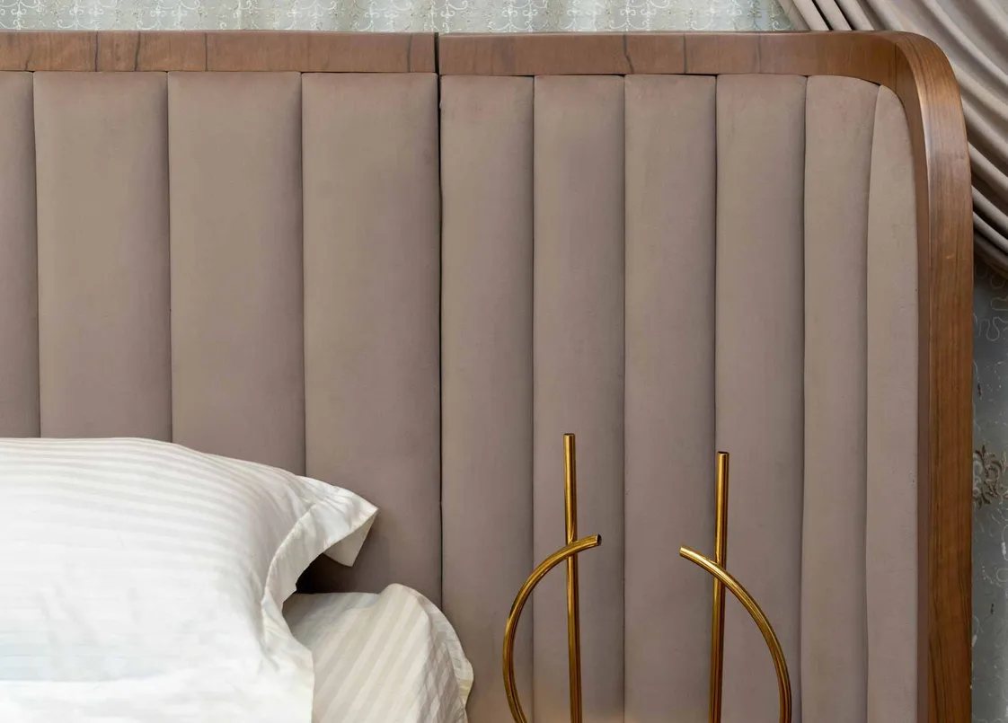 سرير أنيق وعصري يتميز بلوح رأس مبطن بخامة قماشية بلون بني فاتح مع تقسيمات عمودية تضفي لمسة من الفخامة والتميز. إطار السرير مصنوع من الخشب بلون طبيعي يتناغم مع لون اللوح الأمامي. الأبعاد: عرض 200 سم × طول 200 سم – مثالي للمساحات الحديثة والأنيقة.