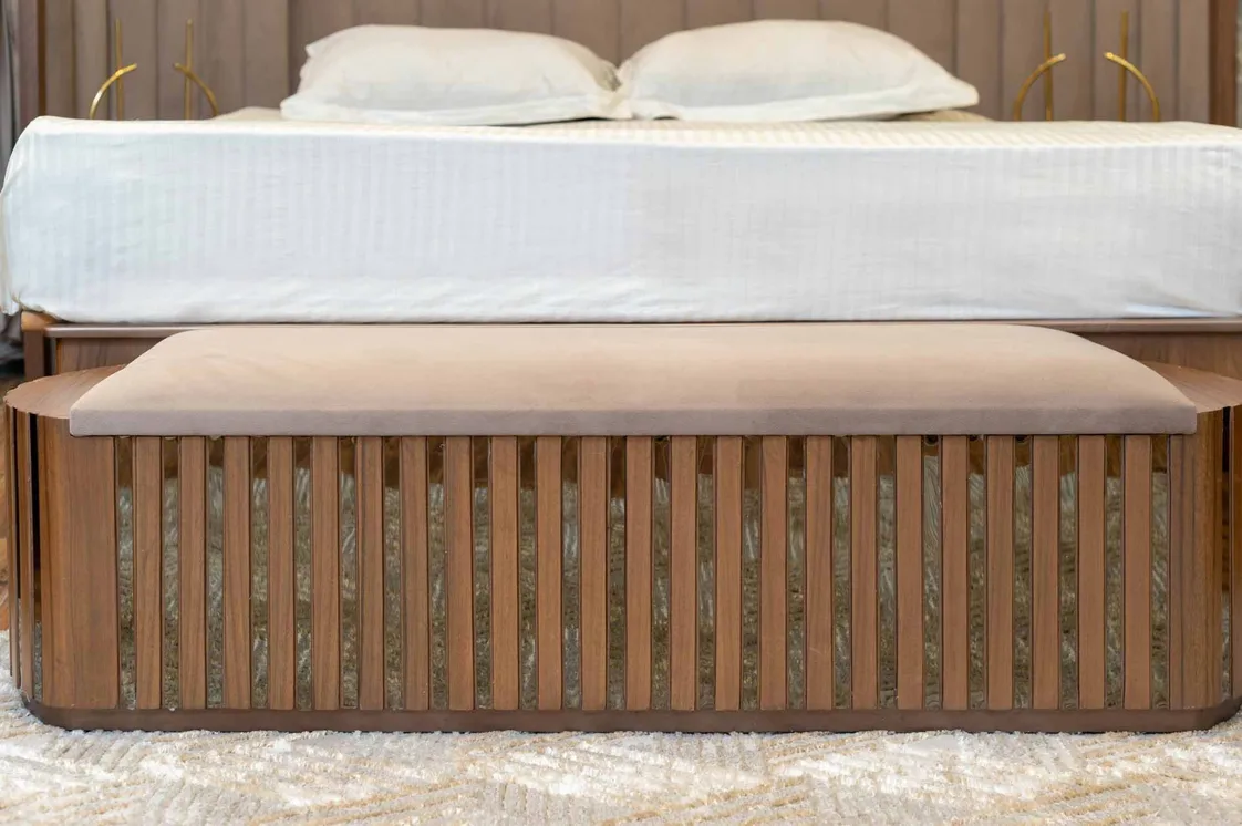 بانكيت بسيط وأنيق مع قاعدة خشبية طبيعية مزودة بشرائح رأسية تضفي لمسة عصرية جذابة. الجزء العلوي مغطى بوسادة مبطنة بلون بني فاتح يتناغم مع لون السرير، مما يوفر راحة إضافية ويجعله مثاليًا للاستخدام في غرفة النوم أو المدخل.