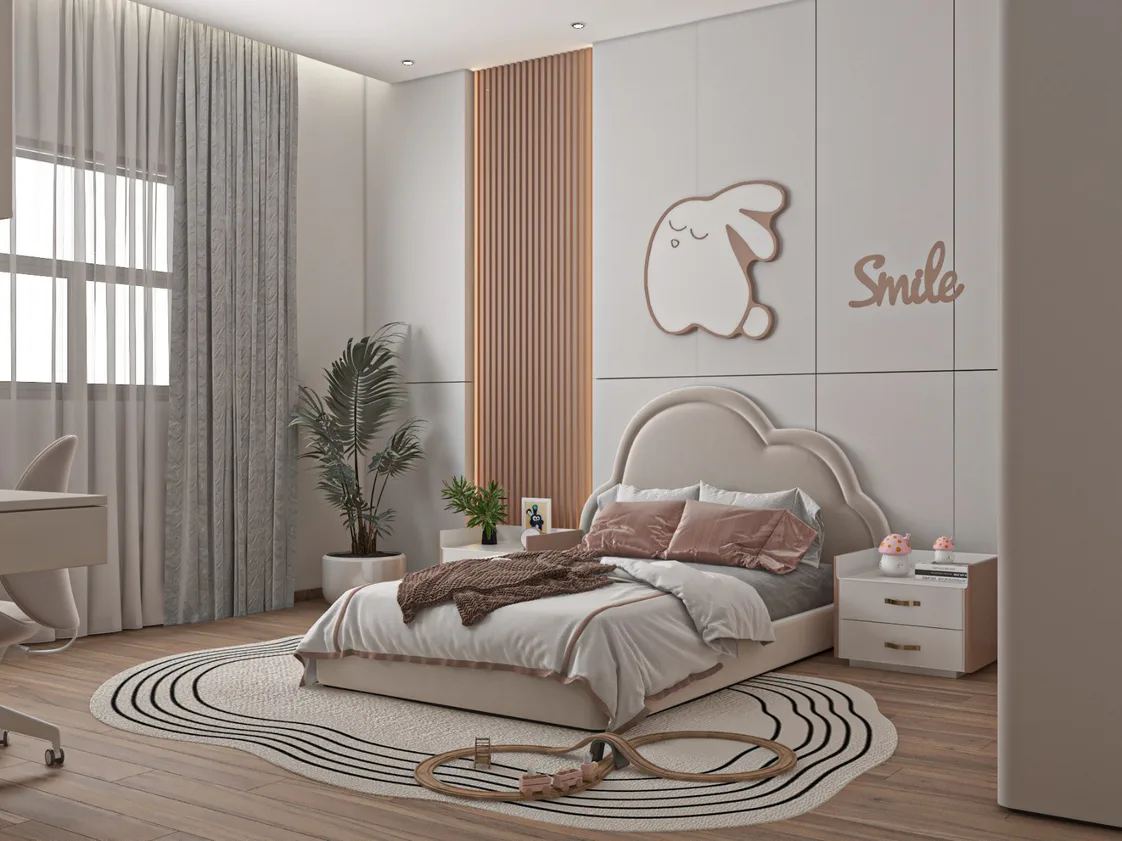 السرير يتميز بإطار مبطن بلون رمادي فاتح ورأس مستدير يشبه السحابة لراحة وأناقة إضافية.