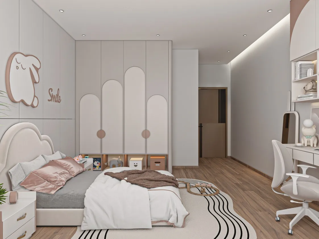 غرفة نوم شباب وأطفال بتصميم مودرن وهادئ، تجمع بين الأناقة والعملية.