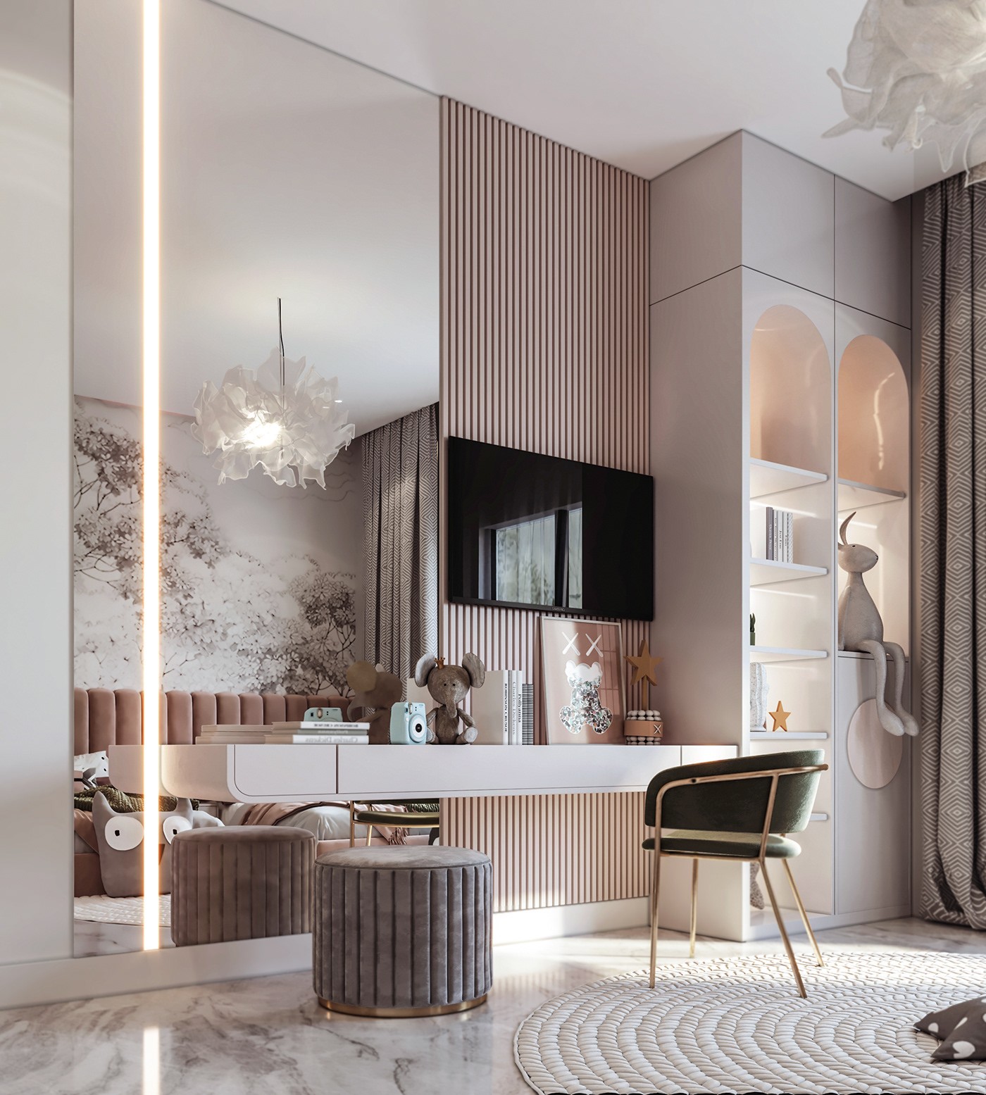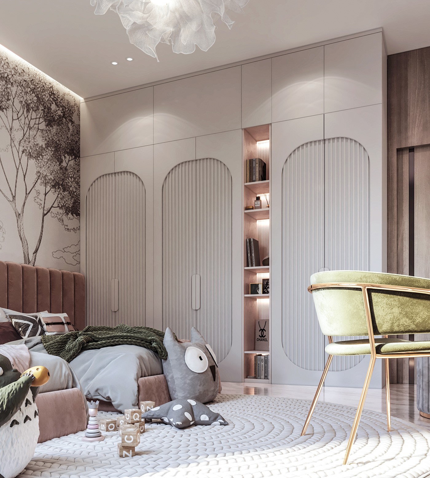 الدولاب: مدمج بالحائط ويأتي بتصميم عصري بلون أبيض، بأربعة أبواب مقوسة ناعمة ومقابض طويلة بنفس اللون. يحتوي على رفوف مضاءة في المنتصف، مثالية للكتب أو الديكورات.