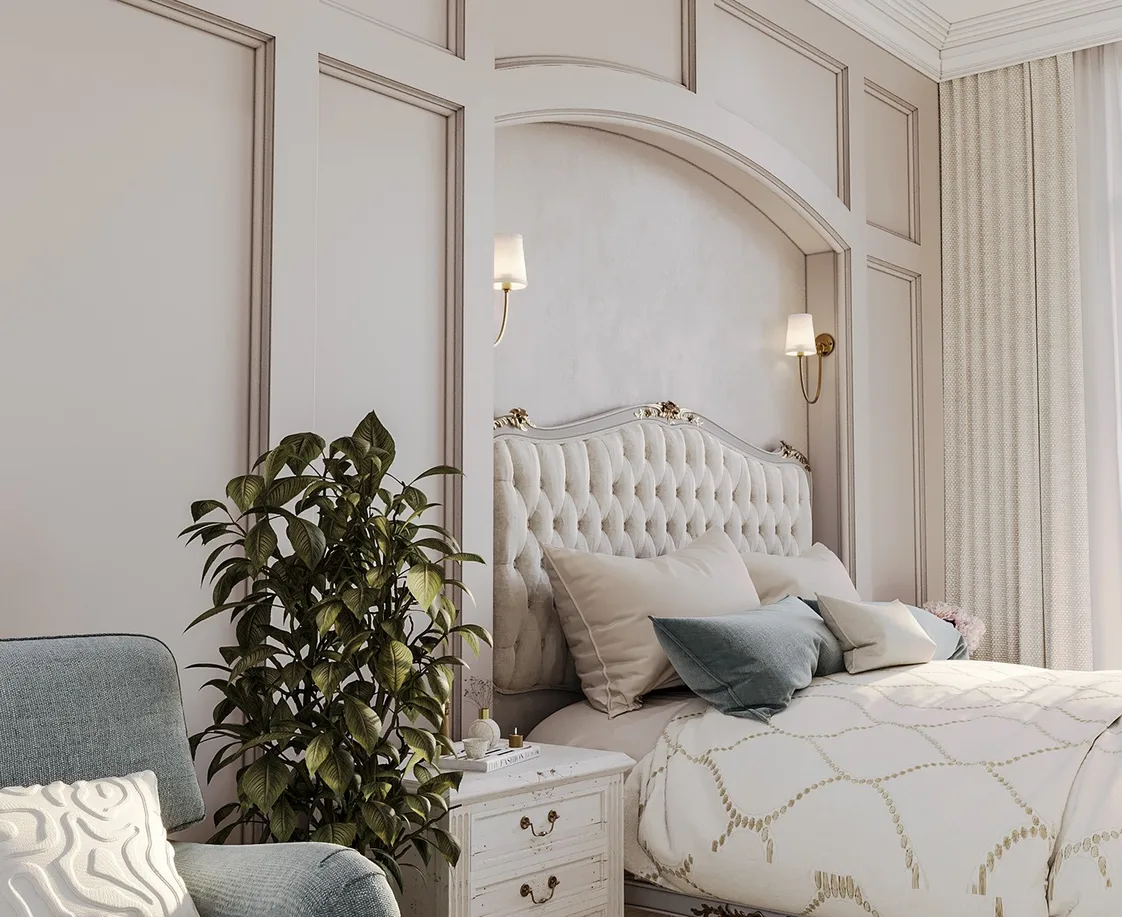 السرير مصنوع من الخشب بتفاصيل زخرفية مذهبة، مما يضيف لمسة من الفخامة. اللوح الأمامي والخلفي مبطن ومغطى بقماش أبيض بتصميم ماسي أنيق. أرجل السرير المصنوعة من الخشب المصقول تتمتع بتصميم منحني وأنيق يتماشى مع الطراز الكلاسيكي. يتميز السرير بالثبات والمتانة مع تفاصيل زخرفية بسيطة عند قاعدته تضيف لمسة من الرقي.