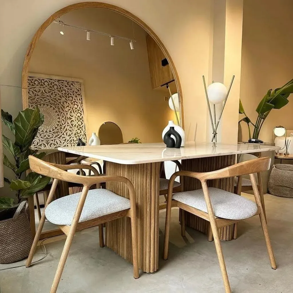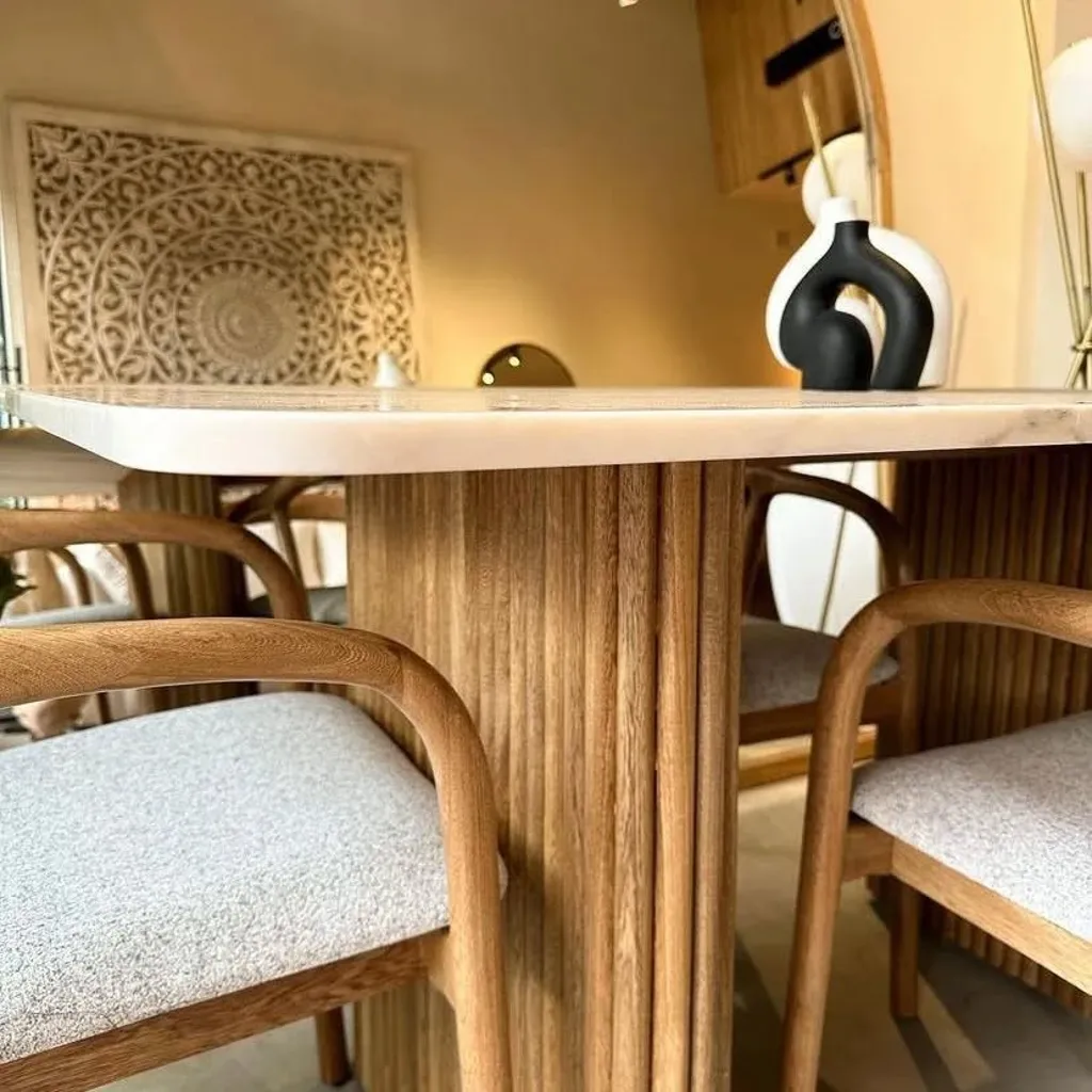 ترابيزة طعام أنيقة بسطح مصنوع من الرخام الأبيض الأملس يمنح مظهرًا فاخرًا وعصريًا، مع أرجل خشبية طبيعية تضيف ثباتًا ولمسة دافئة من الجمال الطبيعي.
