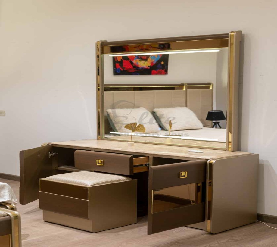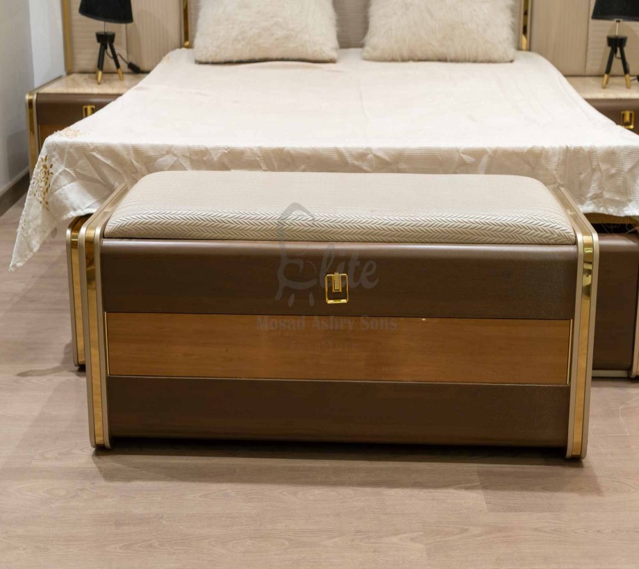 استمتع بأجواء من الراحة والفخامة مع غرفة نوم مودرن بتصميم عصري يجمع بين اللون البيج الفاتح والجولد اللامع. تتكوّن الغرفة من سرير رئيسي بتفاصيل ذهبية أنيقة، دولاب واسع بتصميم عصري، تسريحة بمرآة كبيرة، 2 كومود بتصميم متناسق، بالإضافة إلى بانكيت بتصميم مريح لراحة إضافية. هذه الغرفة مثالية لمن يبحث عن أسلوب حياة راقٍ وأنيق في مساحته الخاصة.