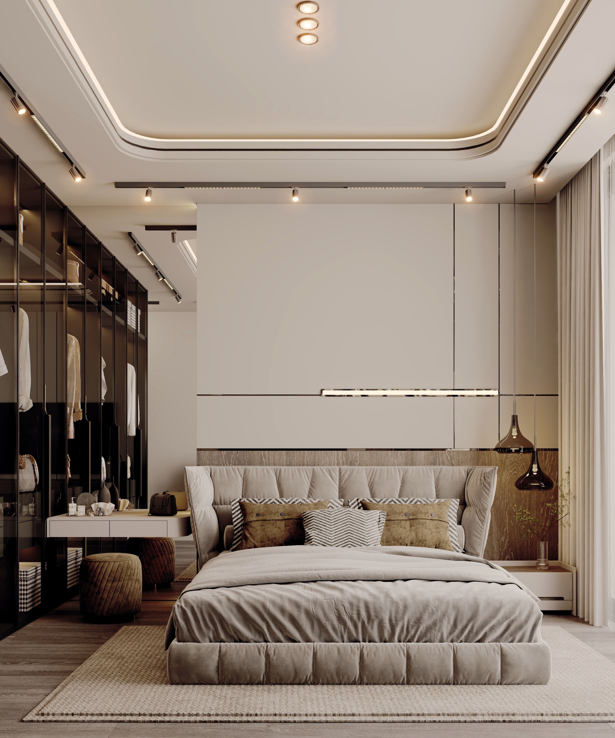 غرفة نوم مودرن باللون البيج والجولد – تصميم أنيق يجمع بين الراحة والفخامة
