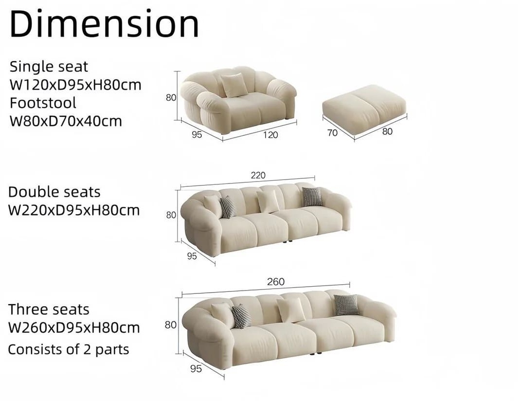 الكنبة الكبيرة: بتصميم عصري بسيط، مغطاة بقماش ناعم بلون كريمي هادئ. تأتي بمساحة جلوس واسعة ووسائد مريحة توفر أقصى درجات الراحة والدعم، ما يجعلها مثالية للاسترخاء في غرف المعيشة.