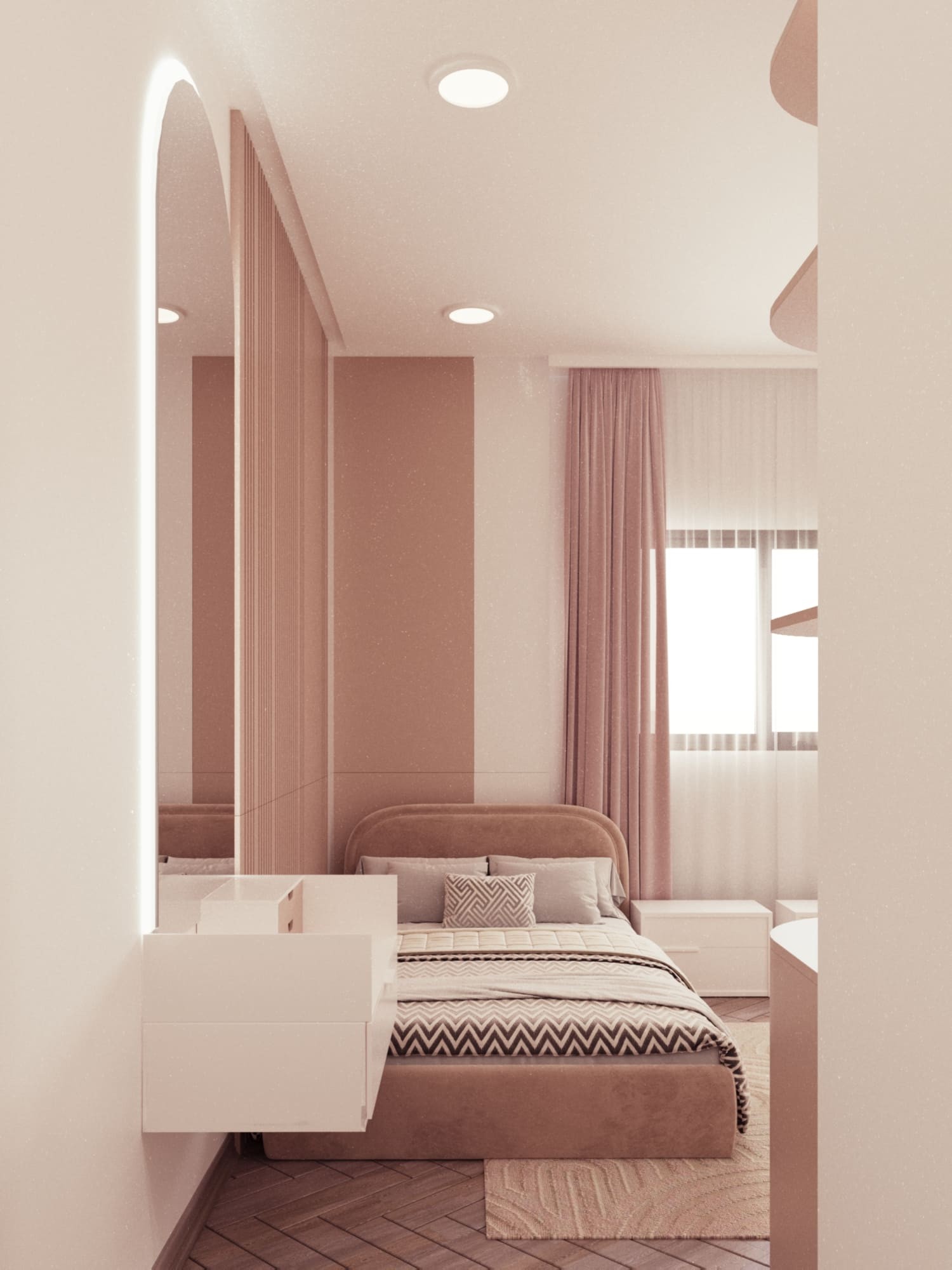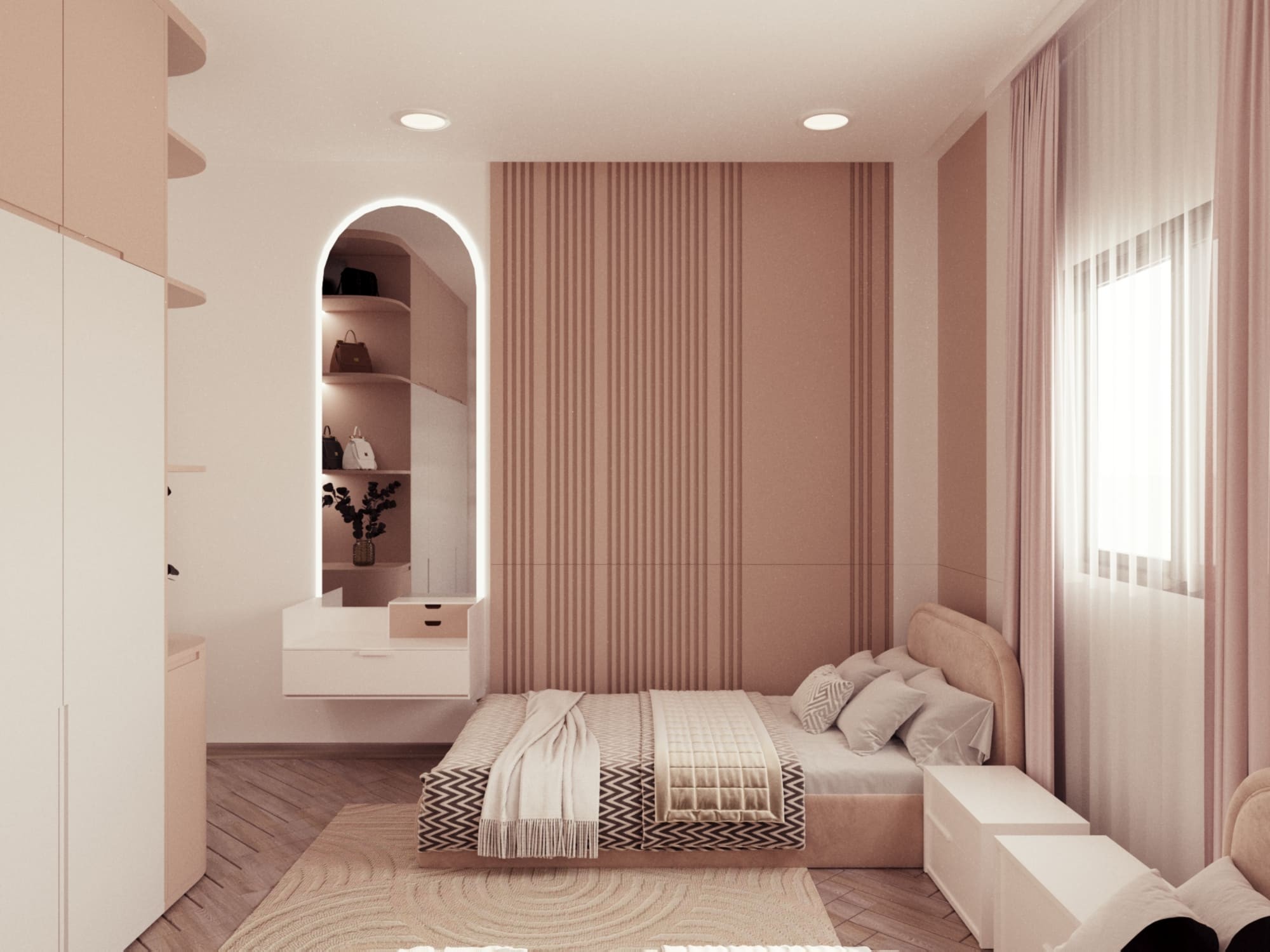 تصميم الطقم يجمع بين الألوان الهادئة والخطوط البسيطة، مما يخلق جوًا مريحًا وعمليًا في الغرفة.