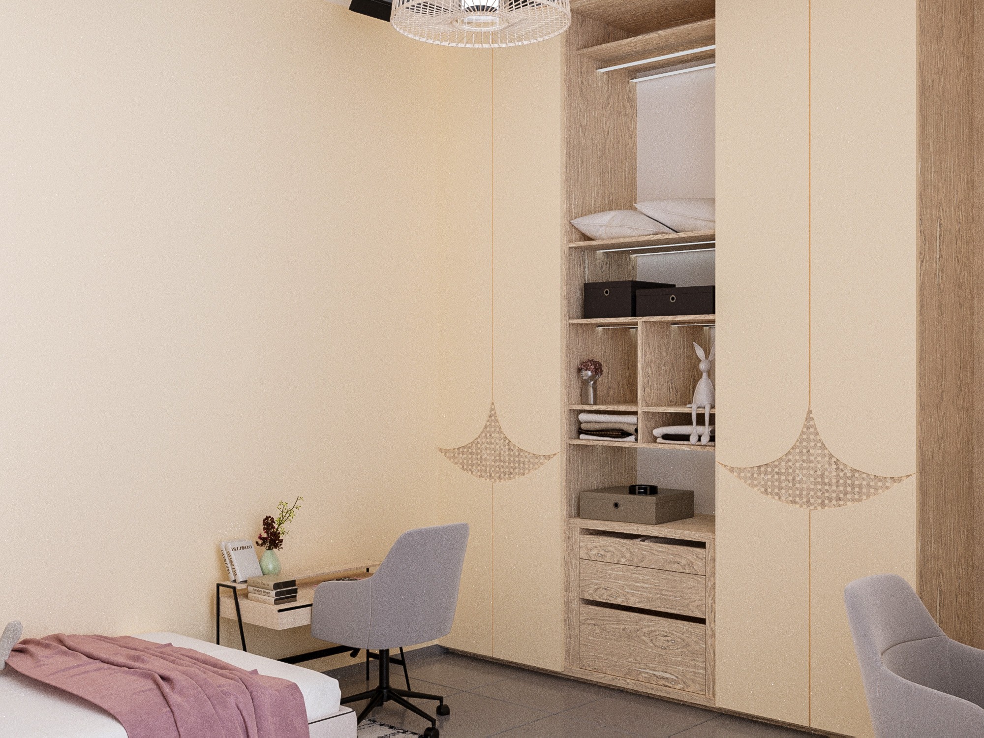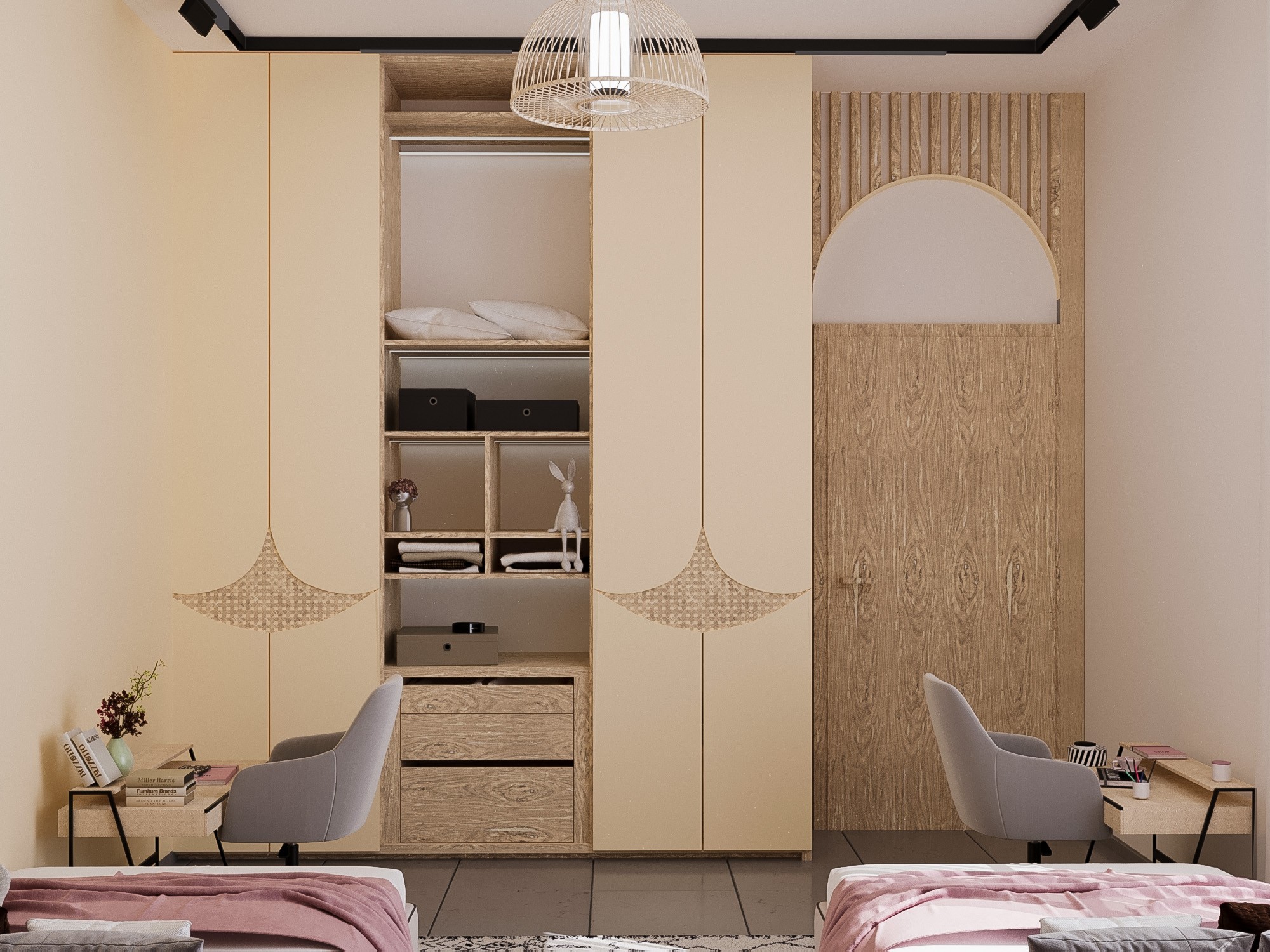 دولاب خشبي بتصميم أنيق بلون بيج هادئ مع رفوف وأدراج – لمسة جمالية ووظيفة عملية لغرف النوم
