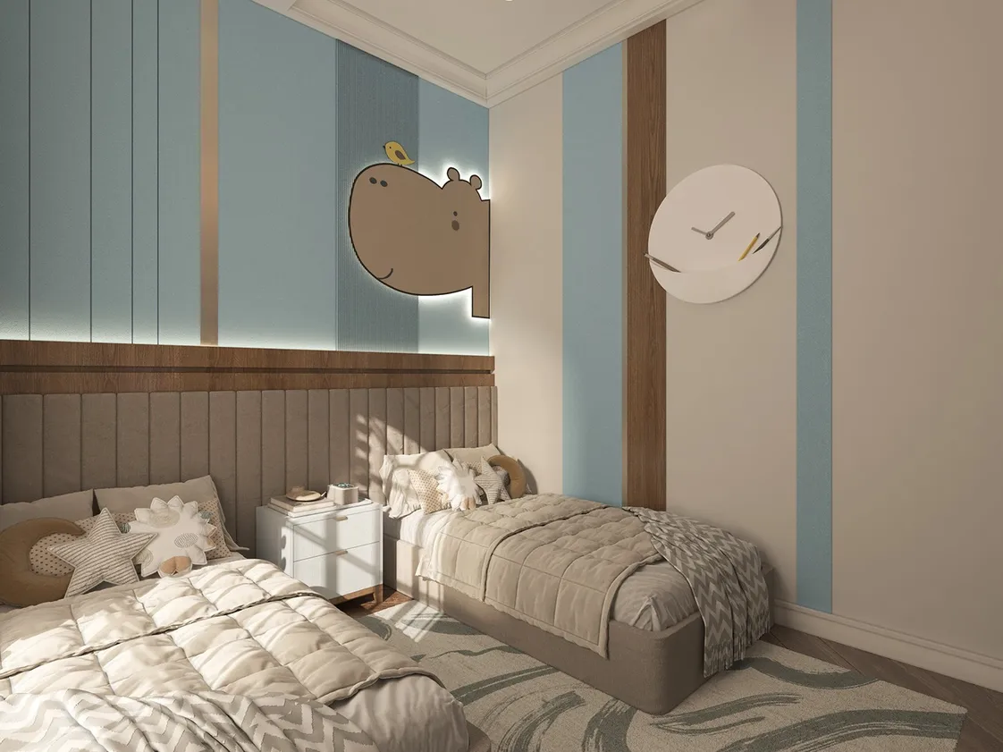 الأسرة: تتميز كل سرير بتصميم بسيط وأنيق مع لوح رأس مُنجَّد بخطوط رأسية، مما يضيف لمسة عصرية. الهيكل منخفض ومستطيل الشكل مما يمنح مظهراً نظيفًا وثباتًا قويًا.