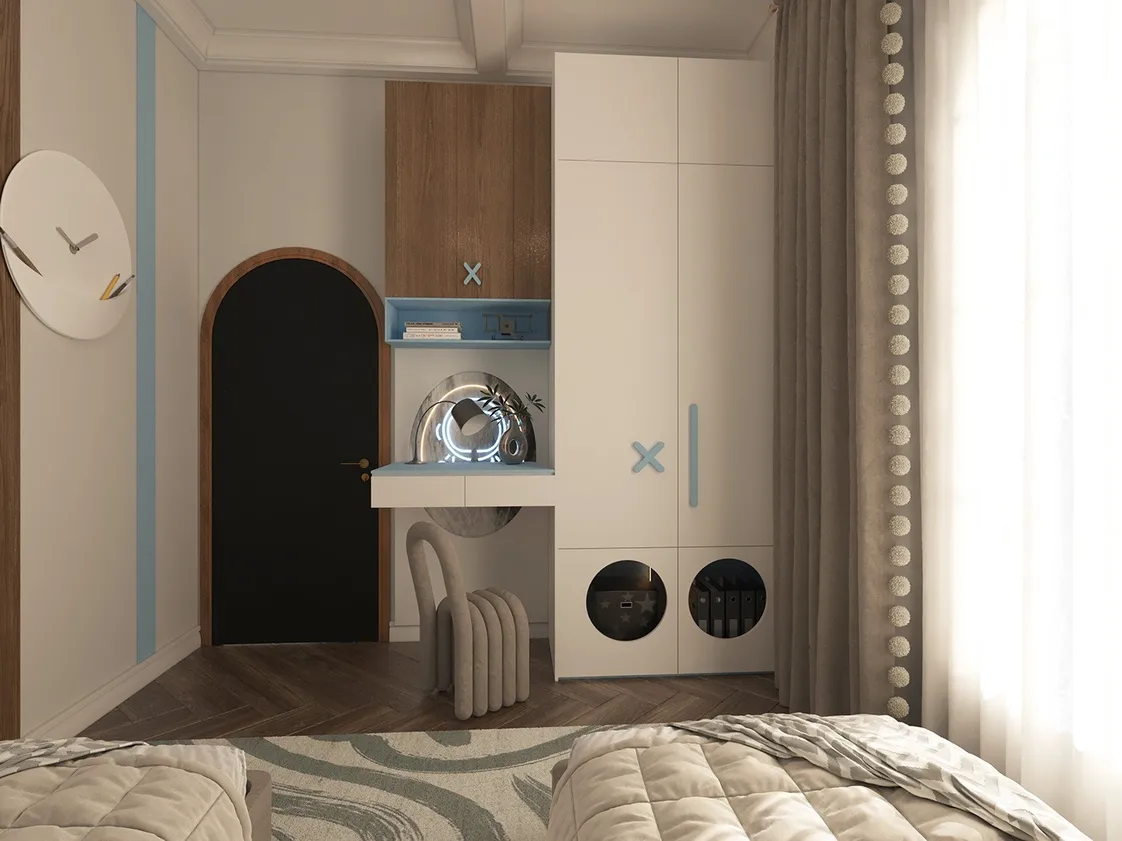 الدولاب: يتمتع بتصميم عصري مع أبواب بيضاء ومقابض زرقاء بارزة وفتحات دائرية تحتوي على صناديق تخزين عملية. يجمع بين الجمال والوظائف العملية.