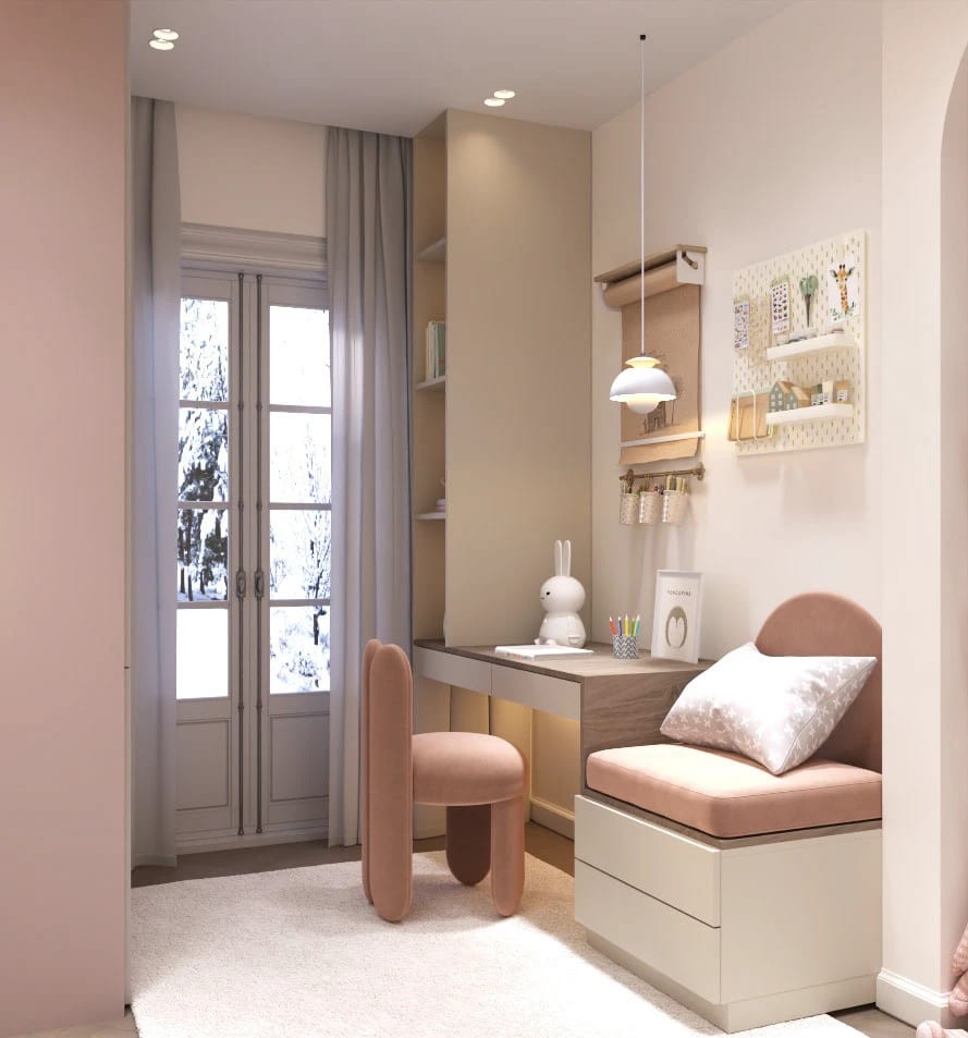كرسي المكتب: يتميز بتصميم فريد مع ظهر مستدير ومبطن، ومقعد مريح يدعم الاستخدام الطويل. يتناغم تصميمه مع المكتب ليقدم تجربة مريحة وجذابة، مما يجعله اختيارًا مثاليًا للعمل أو الدراسة.
