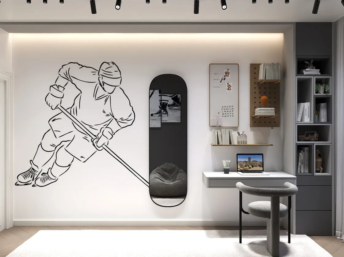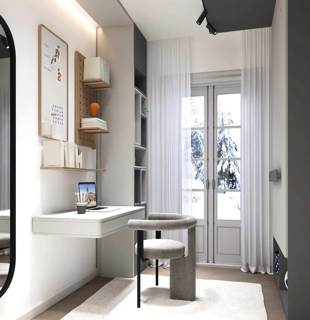 المكتب: يتميز المكتب بتصميم عصري بسيط مع سطح أبيض عائم مثبت مباشرة على الحائط. يحتوي المكتب على درج واحد وأرفف جانبية لتخزين الأدوات والملحقات بشكل منظم. تصميمه العصري يضمن إضافة طابع عملي وأنيق لأي مساحة.