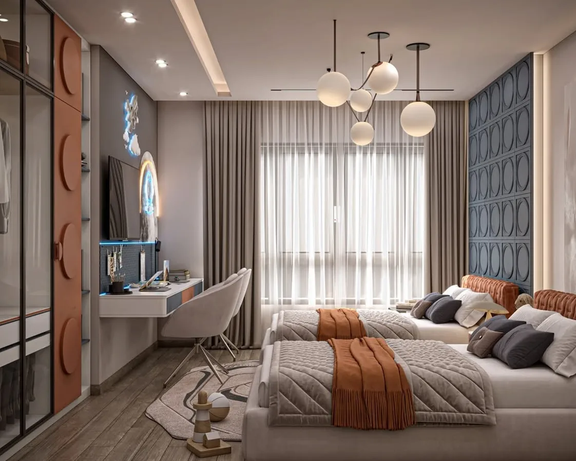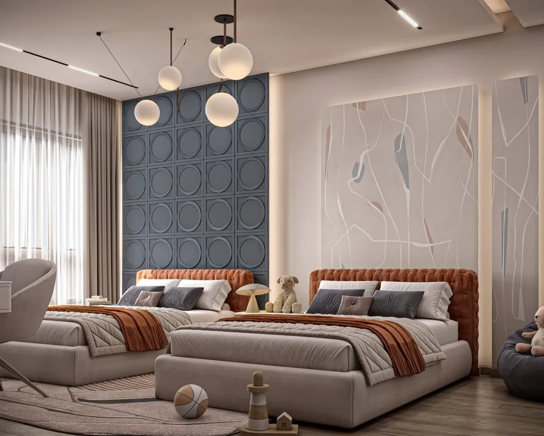 سريرين بإطار منخفض ومبطن بلون بيج فاتح مع رأس مبطن مغطى بقماش بني فاتح، يمنح إحساسًا بالراحة والفخامة مع خطوط انسيابية تناسب الأجواء الشبابية والعصرية.