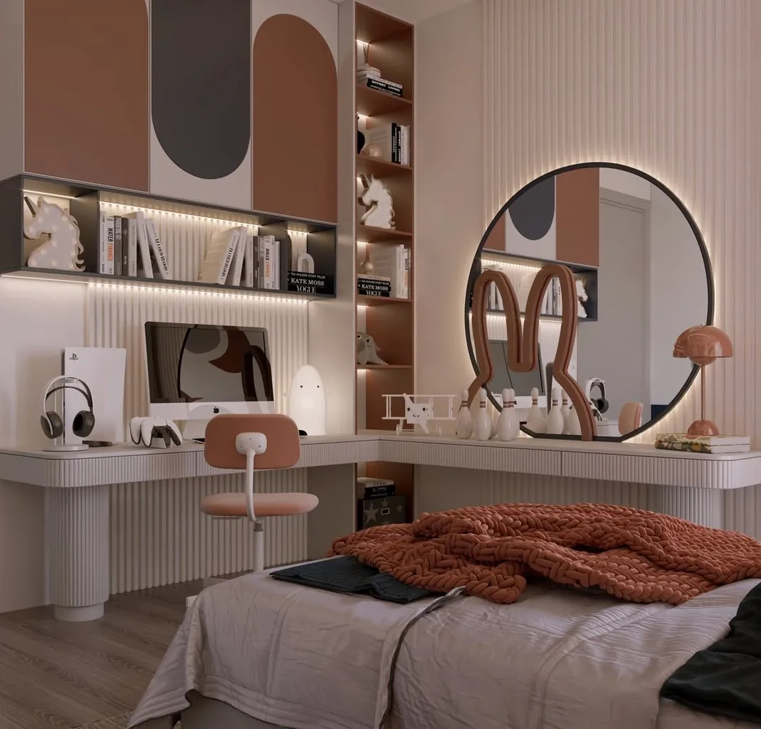 المميزات: تصميم يجمع بين الأناقة والعملية، مثالي لغرف الشباب والأطفال، وحدات تخزين متعددة، مكتب وتسريحة متصلان