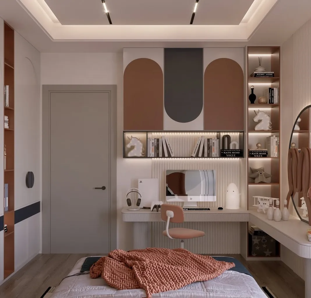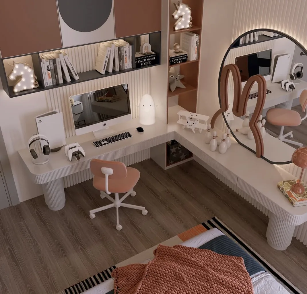 يأتي المكتب بلون أبيض بتصميم عملي، مع سطح واسع وخزانة علوية تجمع بين الأبواب المغلقة والرفوف المفتوحة للتنظيم. يتميز تصميم المكتب والتسريحة بترابطهما على شكل حرف L، مع قاعدة إسطوانية بيضاء تضيف ثباتًا وأناقة عصرية.