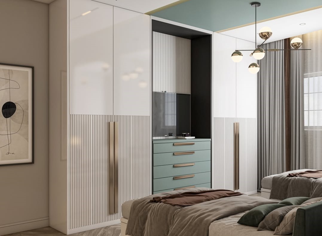 دولاب واسع بأبواب لامعة وأدراج ملونة