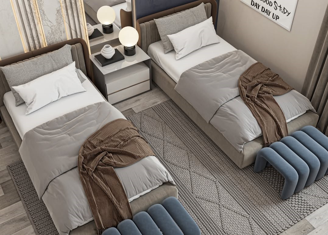 سريران بإطار خشبي مبطن بقماش رمادي فاتح، مع لوح رأس مرتفع مبطن بقماش رمادي، ويحيط به لوح آخر باللون البني الداكن، لتوفير راحة إضافية ودعم مثالي أثناء الجلوس.
