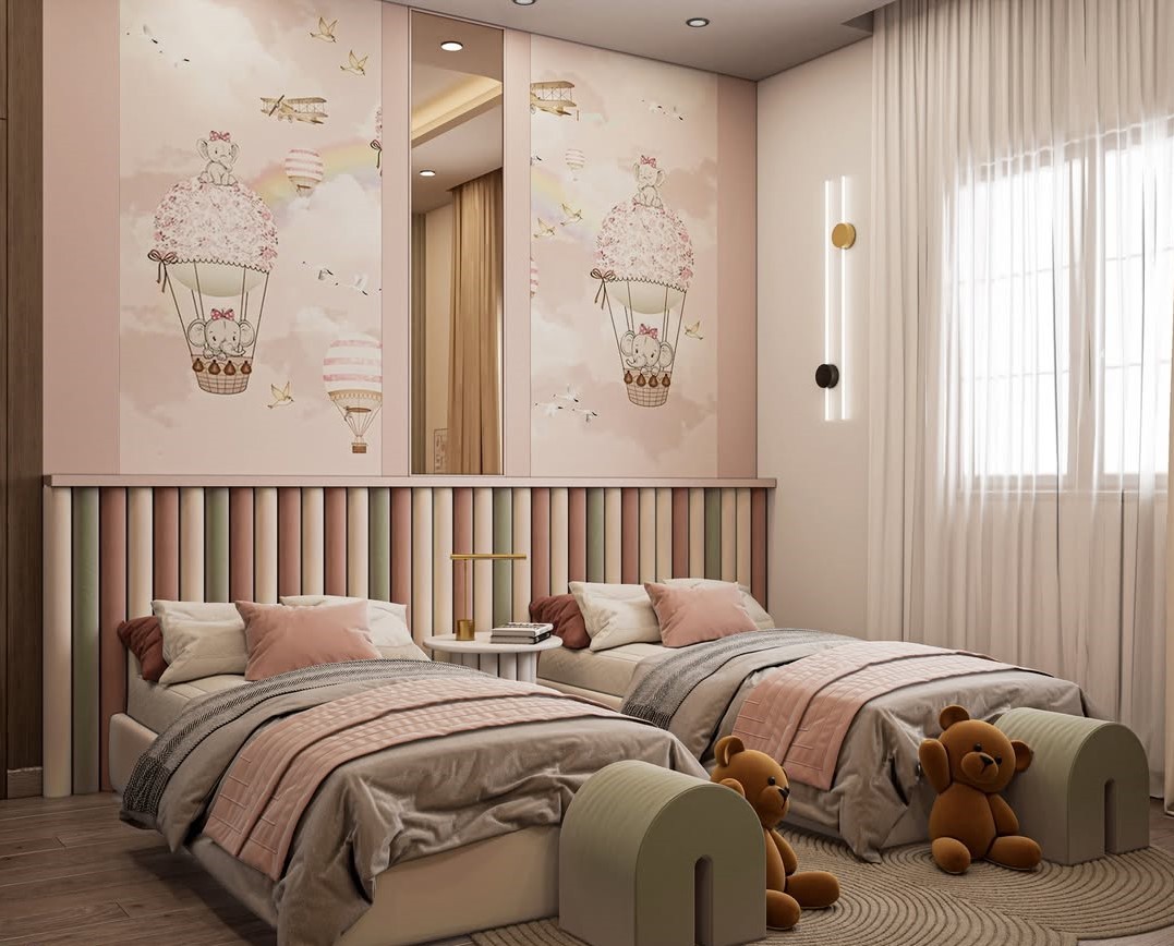يتميز السريرين بتصميم منخفض يعكس الطابع الهادئ والانسيابي، مع قاعدة منجدة بلون بيج فاخر تضفي لمسة راقية على الغرفة. كل سرير مزود بلوح رأس منحني مبطن بتدرجات ألوان ناعمة تشمل الوردي، الأخضر، والبيج، ما يخلق مزيجًا مبهجًا ومتناسقًا يضفي حيوية على المساحة. يمتد اللوح الأمامي المدمج بالحائط بتقسيمات عمودية أنيقة، تمنح عمقًا بصريًا وشخصية فريدة للتصميم.