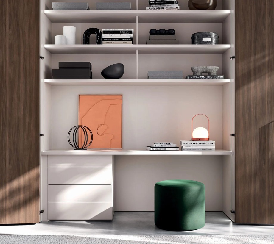 دولاب ملابس مع مكتب مدمج، تصميم ذكي يوفر مساحة للدراسة والتخزين معًا